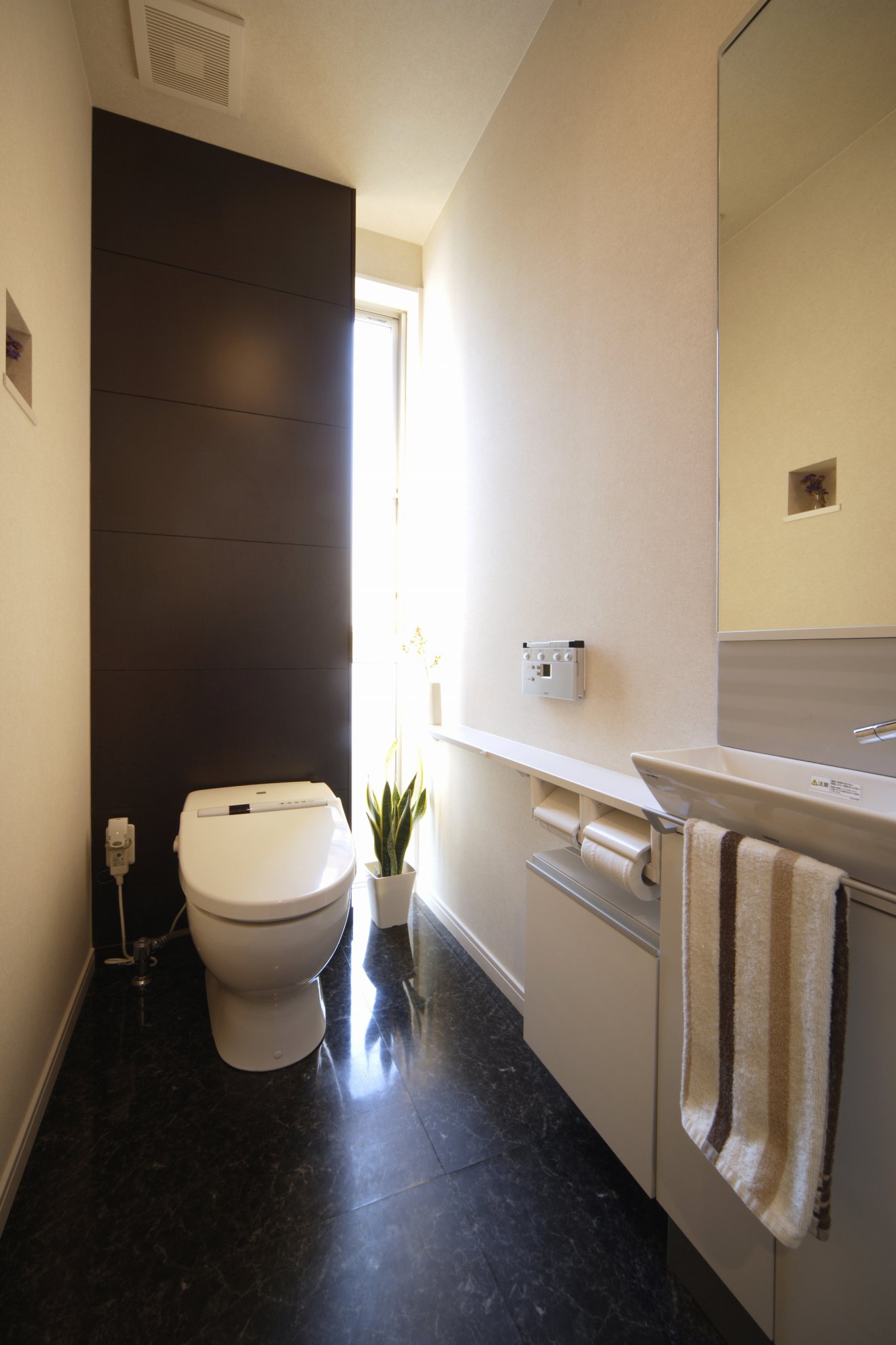 【トイレ】アクセントウォールと床に濃色を配しシックにまとめました。窓から差し込むスリット状の光が床に映し出されて、お洒落な雰囲気を演出しています。