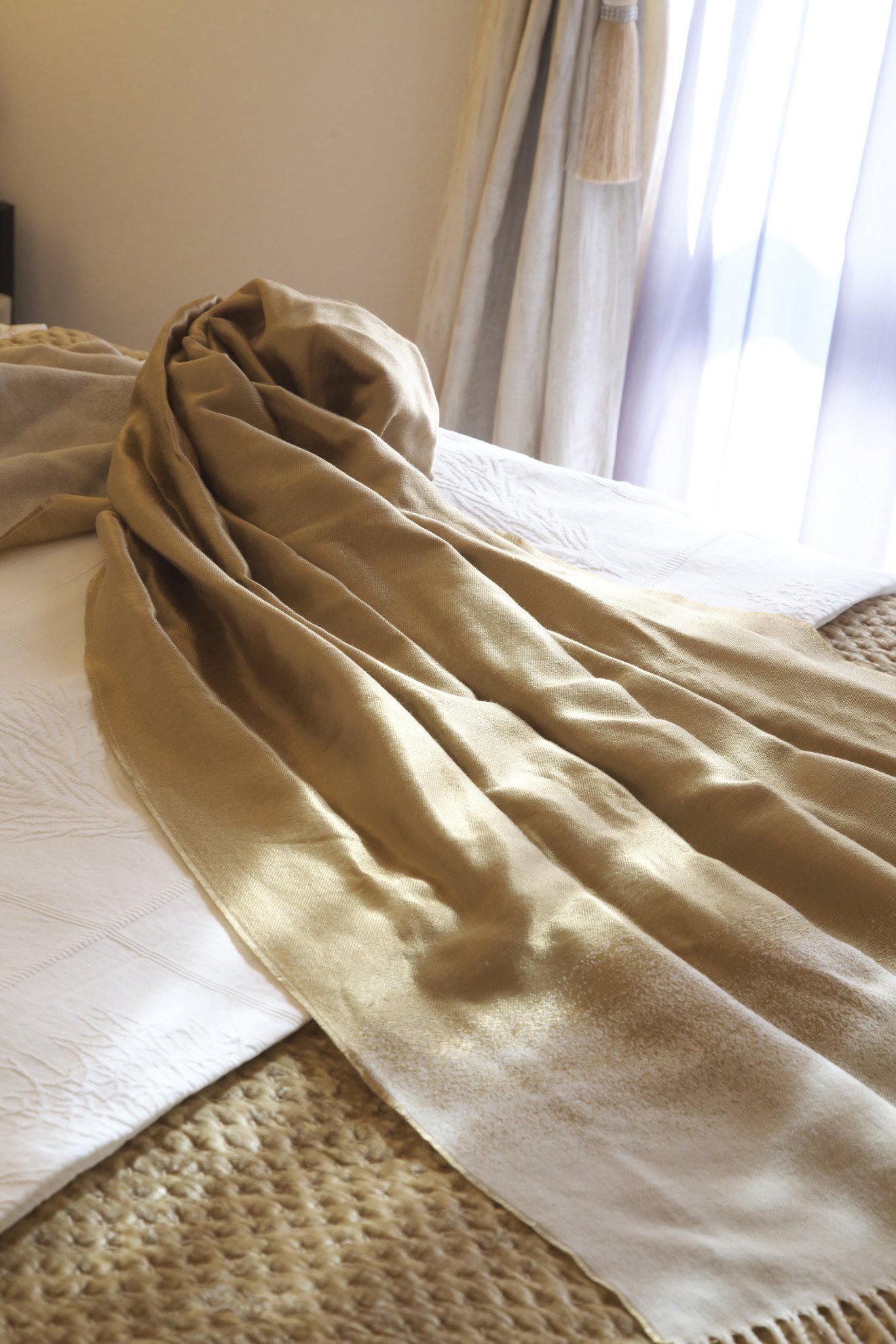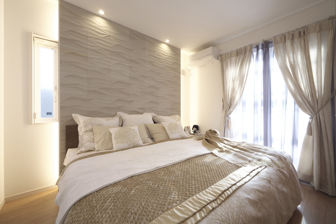 【寝室】波模様の印影が浮かび上がるパネルがアートにもなる寝室。シャンパンゴールド揃えたリネンやファブリックでホテルライクに仕上げました。