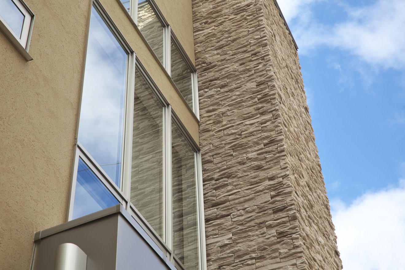 【外観】正面を塗り壁とし、右サイドは石張りタイルに。モダンなデザインと古風な雰囲気がミックスされた、普遍的で安定感ある仕上がりとなっています。