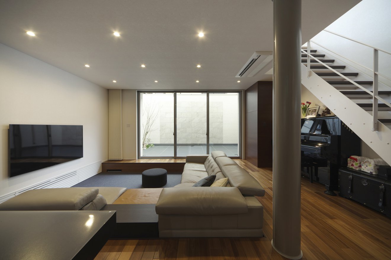 【リビング】奥行きあるLDKをすっきりと見通せるようにゾーニングしました。特にリビングの床を掘り下げた効果は大きく、ソファの背もたれに視界を遮られることなく、テラスまで見通すことができます。