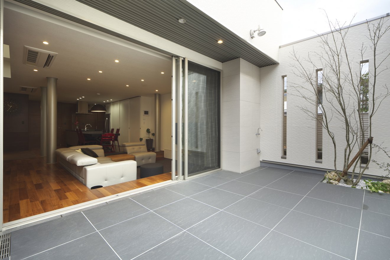 【テラス】隣家が迫る住宅地ということもあり、プライバシーを確保するために壁で囲んだテラスを設けました。カーテンを開ければ、外の景色に溶け込むような開放感を得られます。