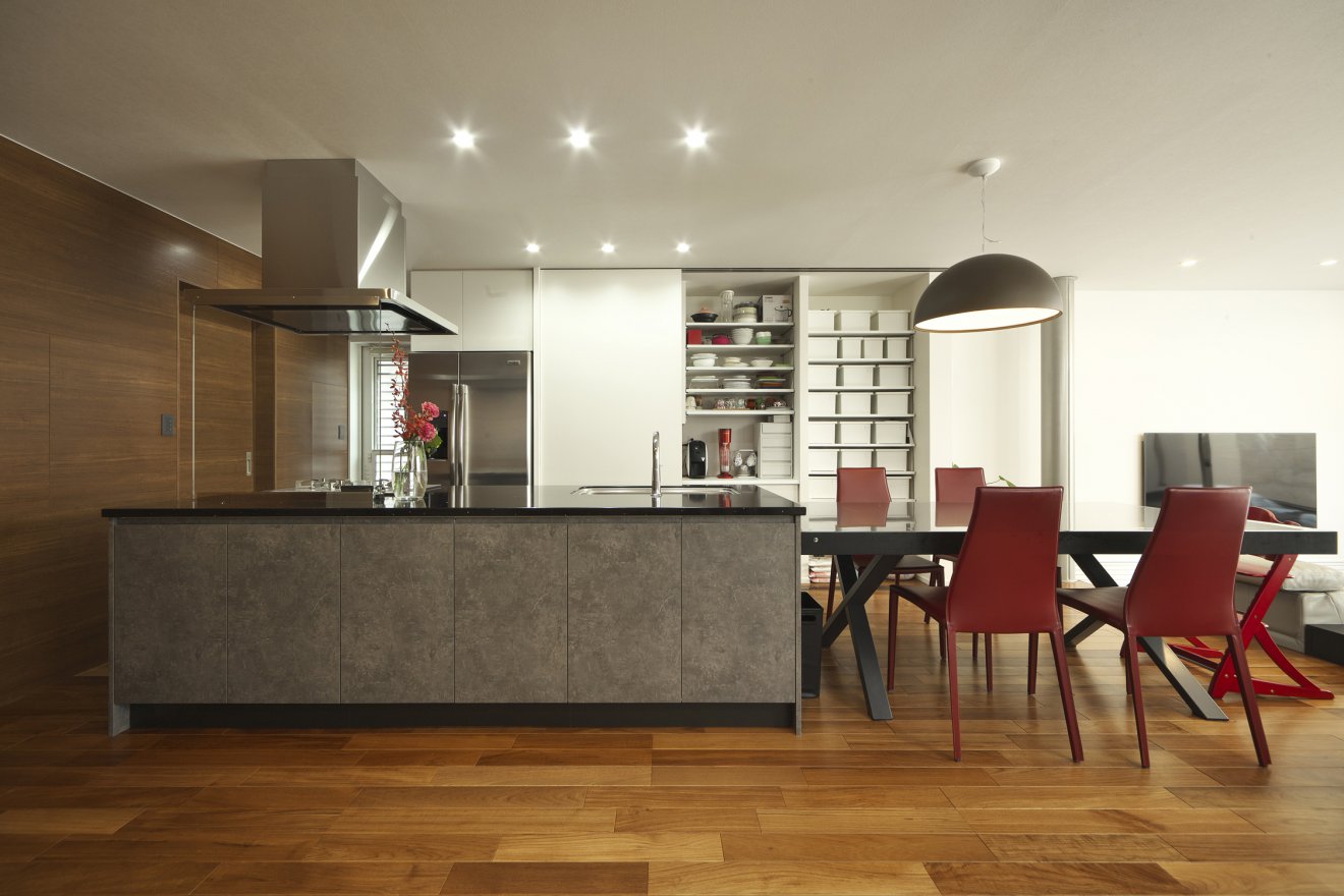 【ダイニング・キッチン】周囲を回遊できるアイランドタイプのキッチン。生活感でインテリアが損なわれないように、棚付きの背面収納は3連の引き戸で隠せます。