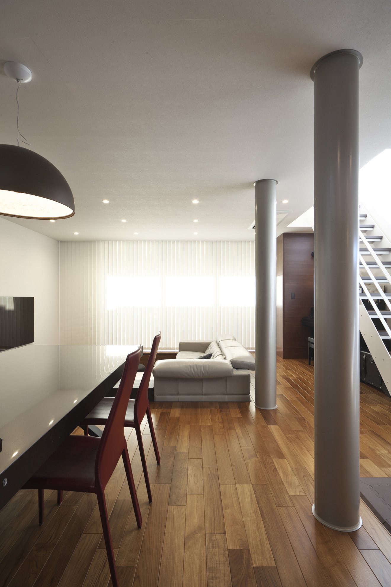 【ダイニング】室内をすっきりと見通せるように、キッチンとダイニングを横並びにレイアウト。構造柱を丸く加工、表面をスチール板で覆いモダンインテリアに合うデザインに仕上げました。