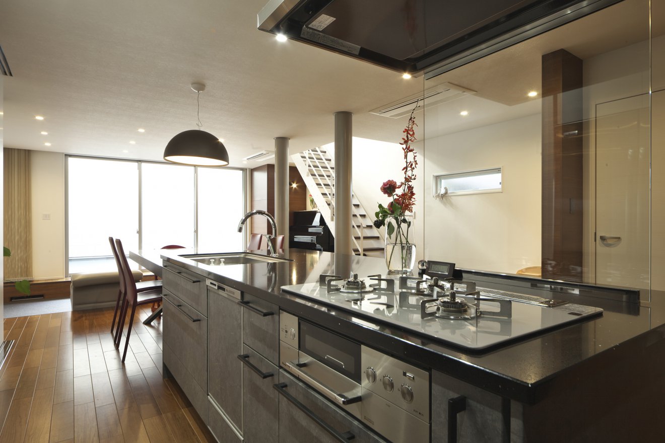 【キッチン】ワークトップを広く使えるフルフラットのキッチン。部屋中を一望でき、家事をこなしながら、子供たちの様子がさりげなく窺えます。