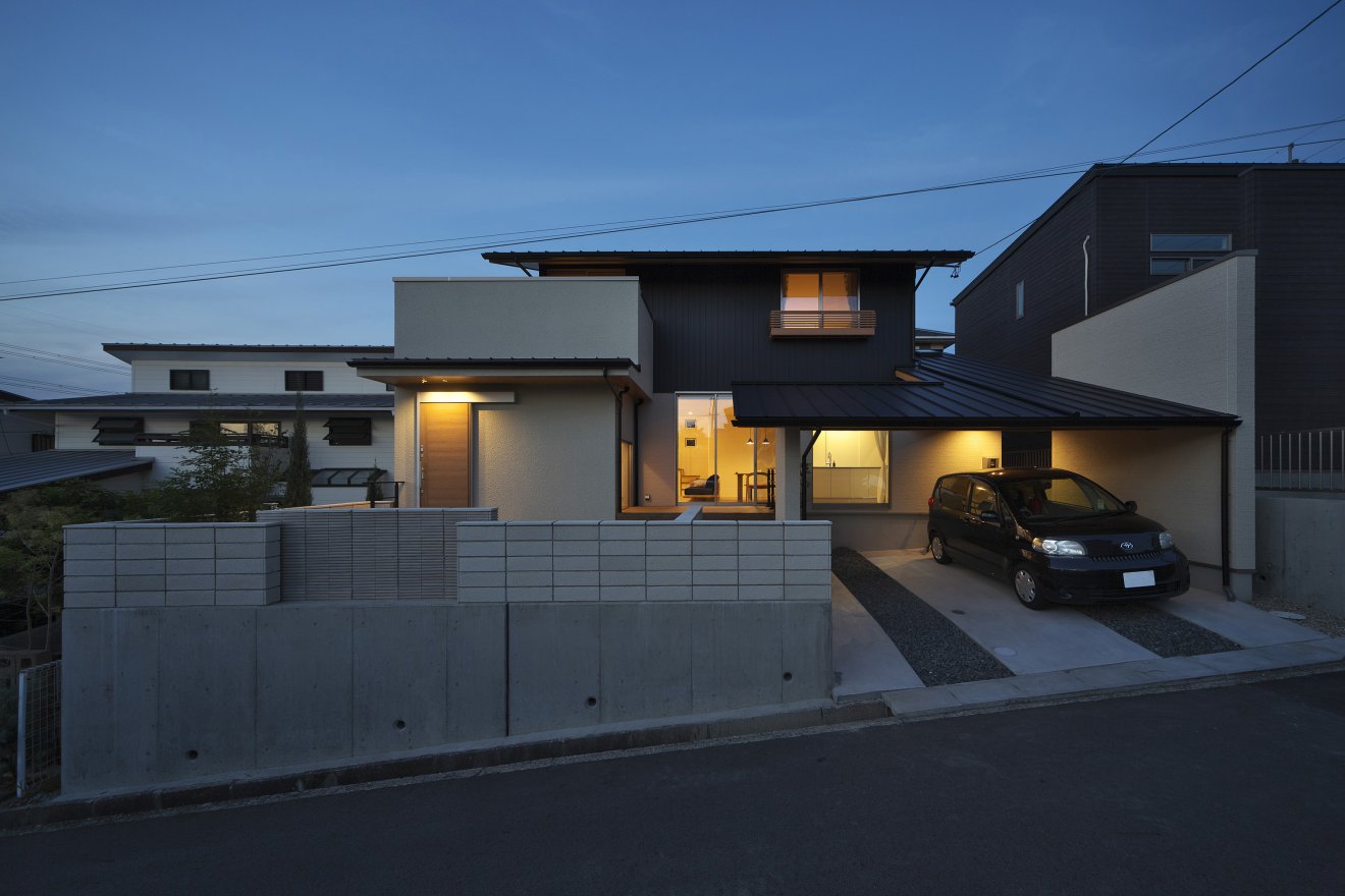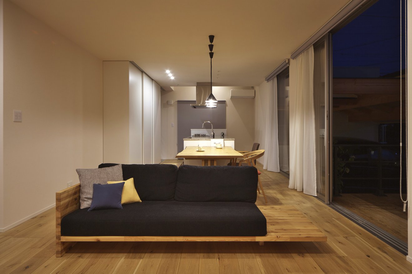 【夜景・外観】黒い町屋風の建物に、現代的なスクエアフォルムがバランスよく組み合わさっている。 【夜景・アプローチ】壁面と同じラインで揃えられたスマートなウッドデッキ。床の高さも室内と合わせているため、窓を開放すればリビングと一体感が味わえます。