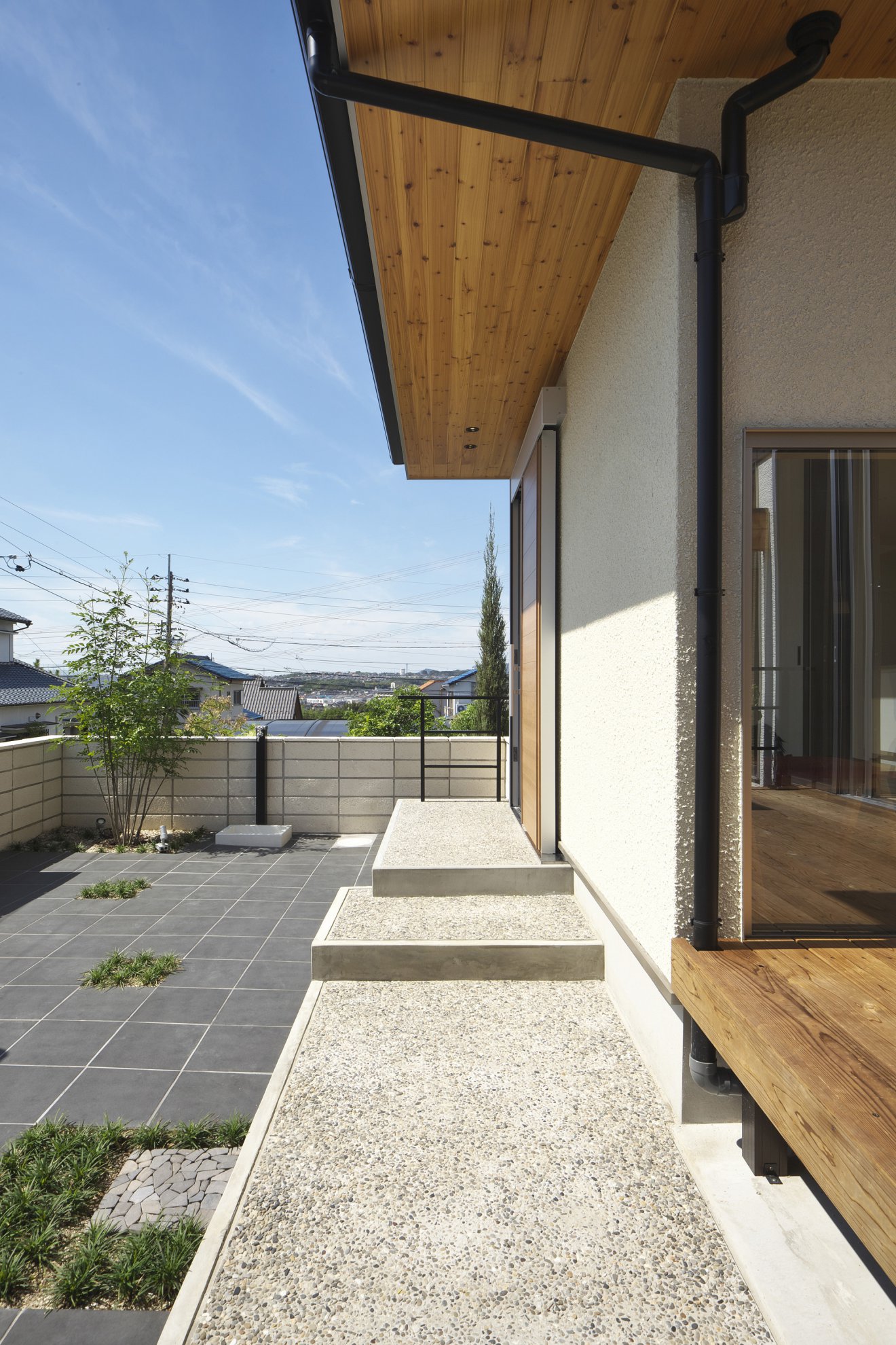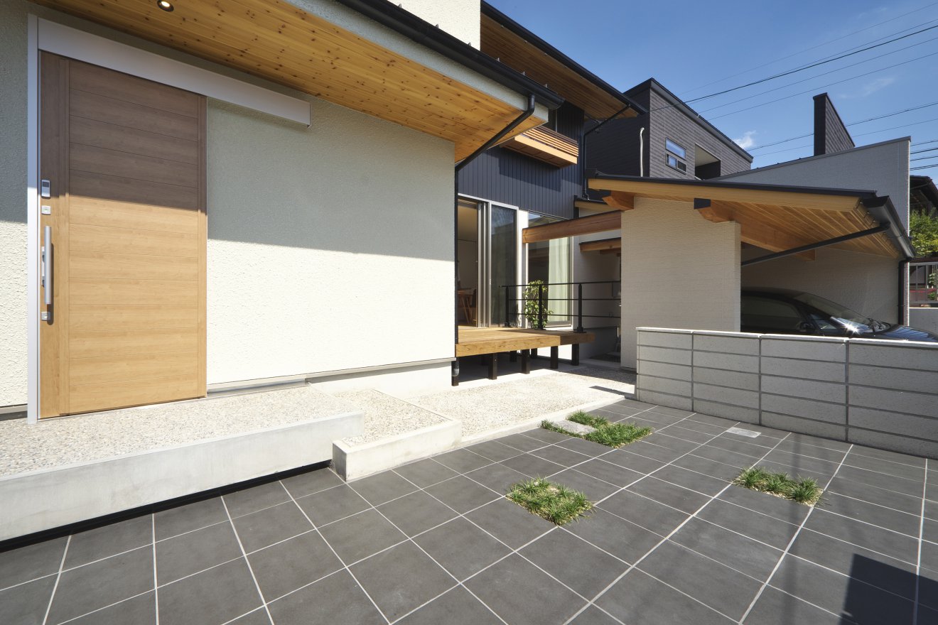 【アプローチ・玄関】趣ある塗り壁にスギ無垢板貼りの軒天井、そこに洗い出しのアプローチを合わせた玄関周り。素材の味わいを活かした秀逸なデザインです。