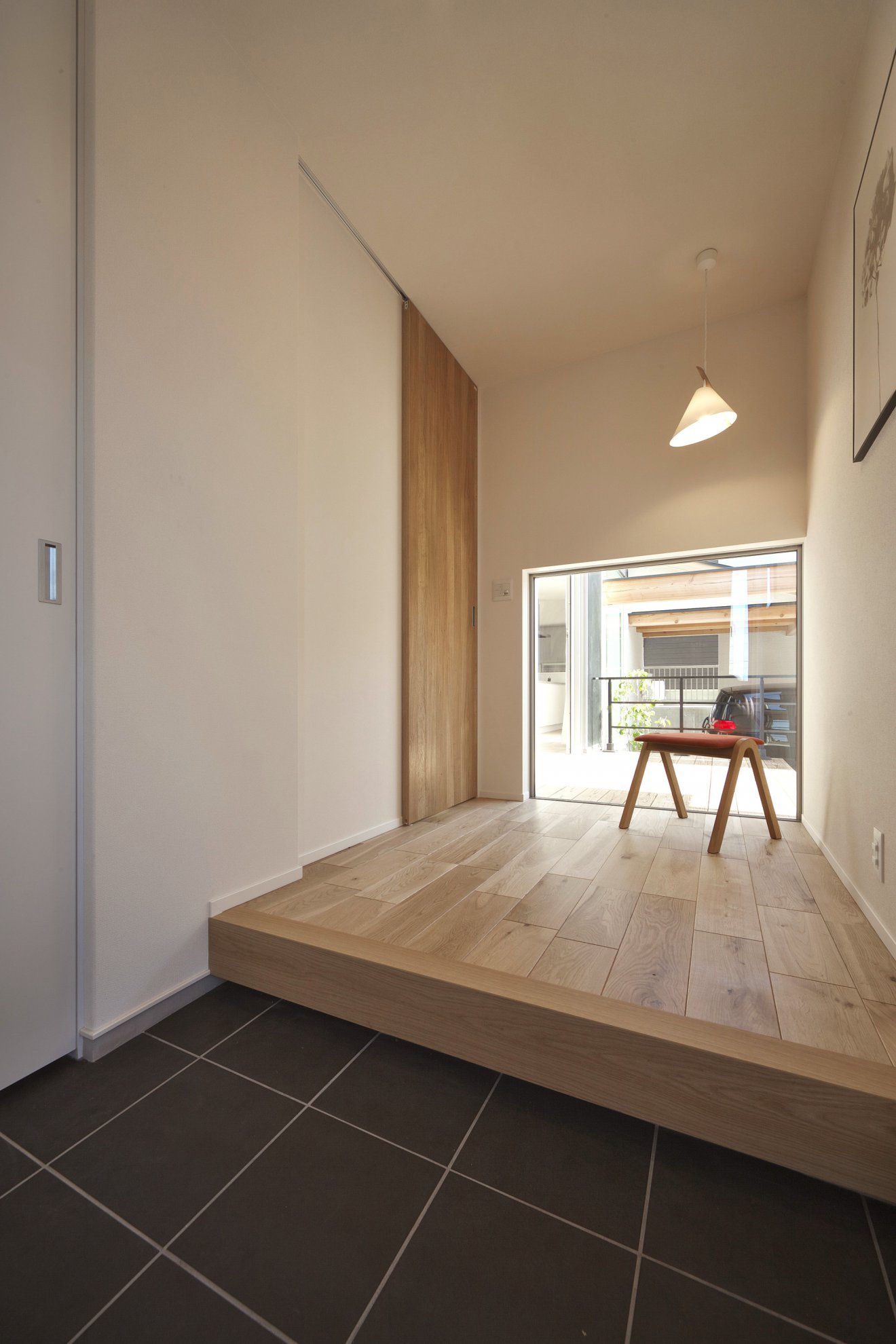 【玄関ホール】デッキから陽光を呼び込めるようにピクチャーウィンドウを施しました。写真手前の白い扉の奥はリビングへの上り口を備えたシューズクロークとなっています。