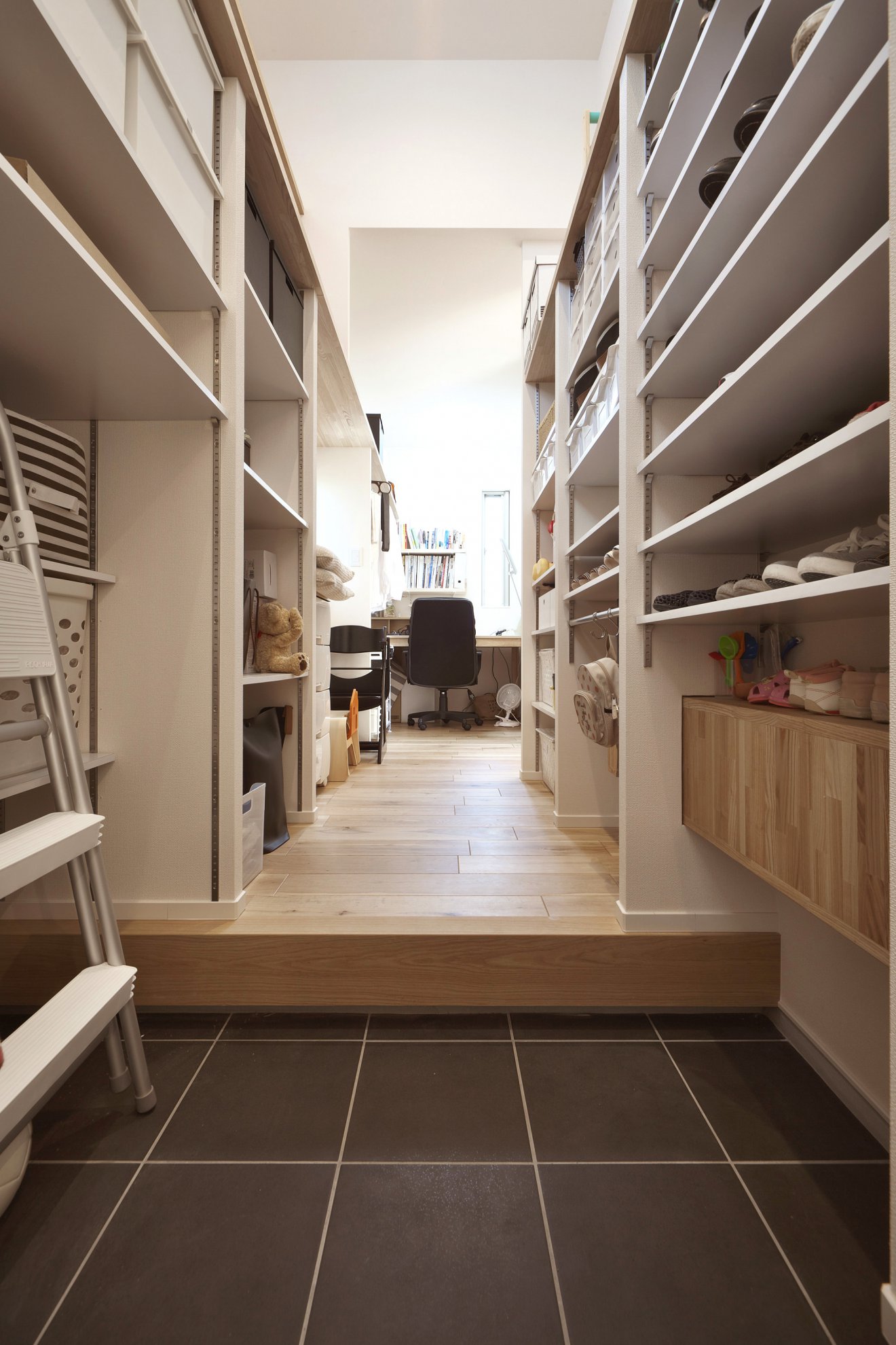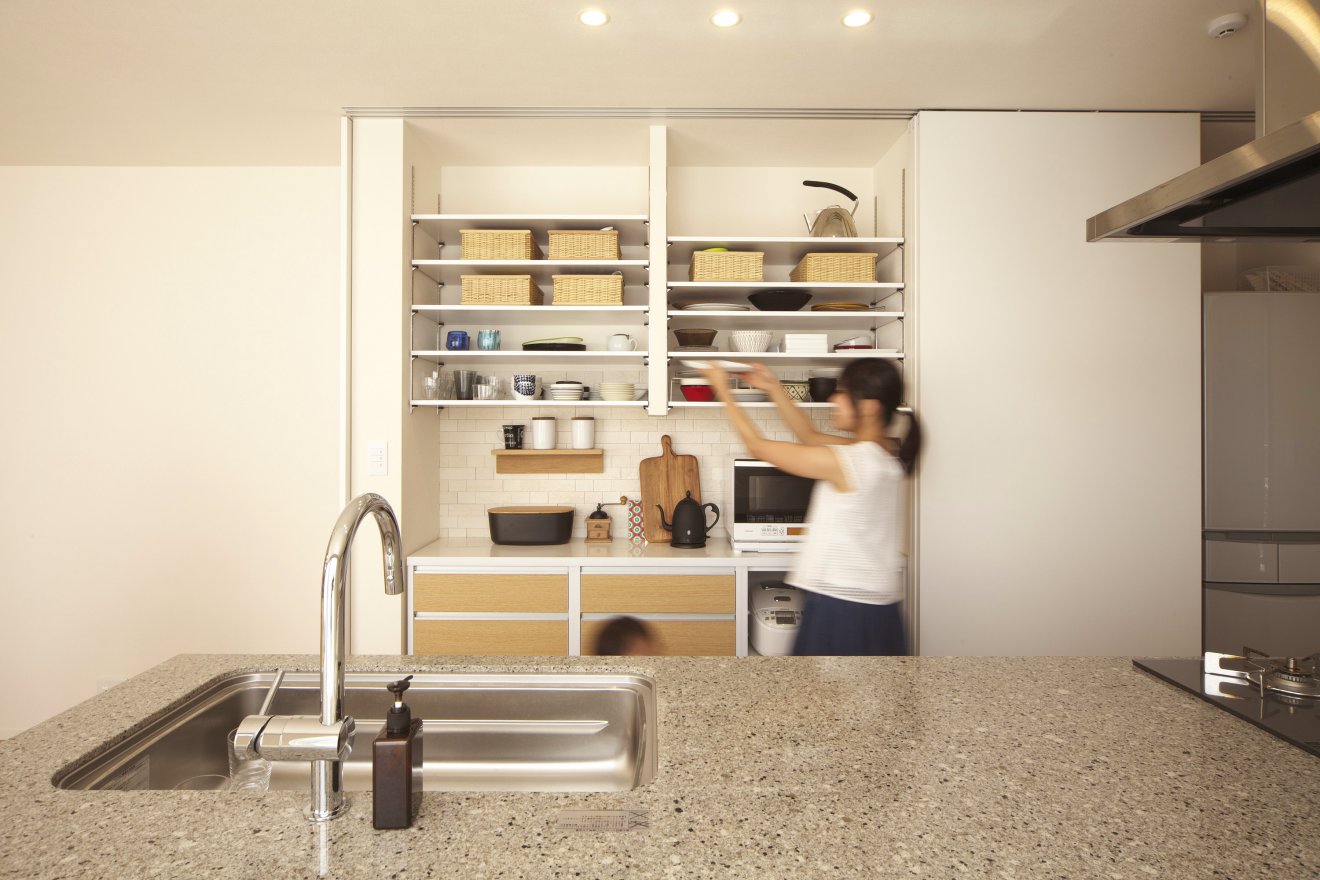 【キッチン・パントリー】キッチンの右奥にパントリーを兼ねた大型収納スペースを配置。背面収納と同様に引き戸で隠すことができるため、生活感を出すことなくお客様を迎え入れられます。