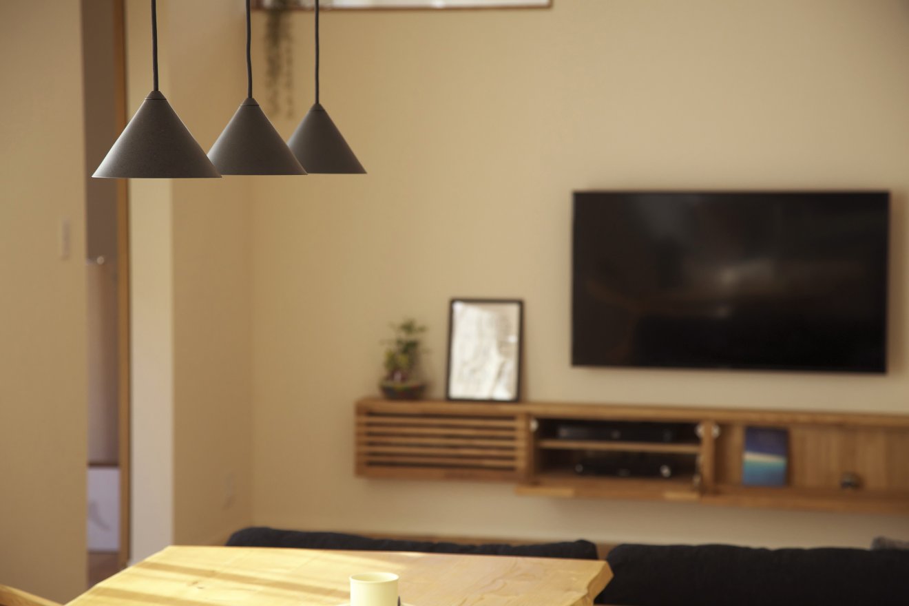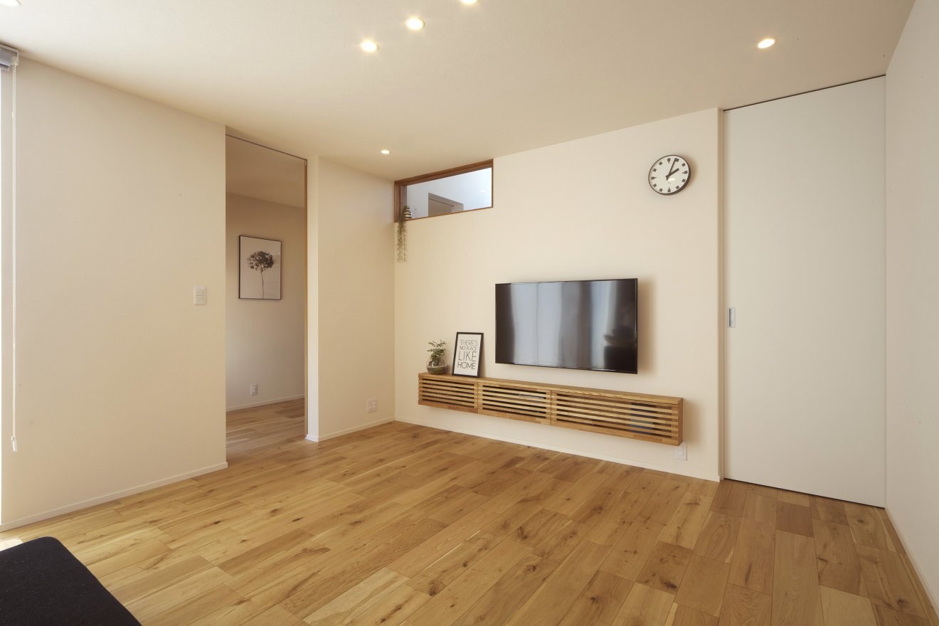【リビング】TVもTVボードも壁付けのスッキリとしたデザイン。床に物がないため、ロボット掃除機の効率も上がります。