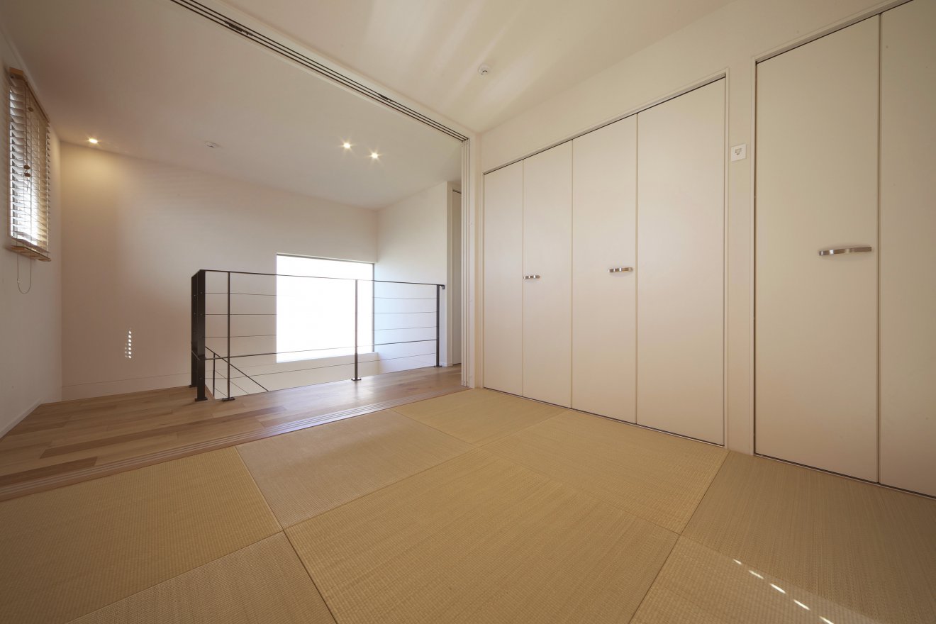 【主寝室】3枚引込戸で全開放できる畳敷きの主寝室。天井に室内干し用の器具が取り付けられており、三方から光が差し込むサンルームとしても利用できます。