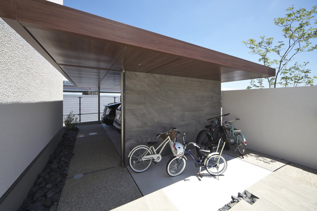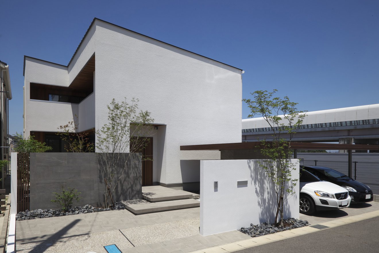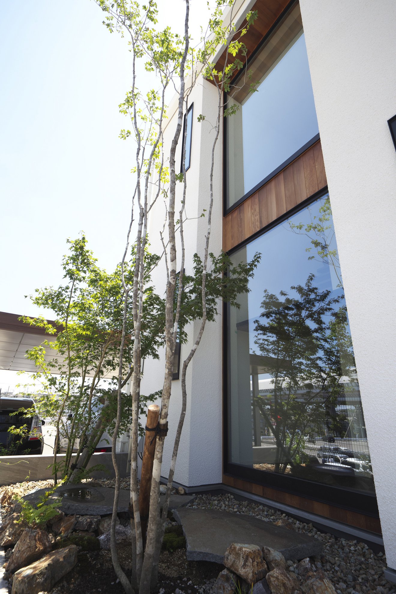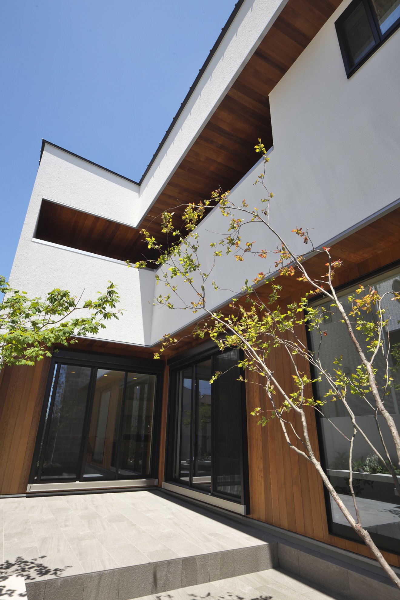 【外観】大きな窓からたっぷりの光が降り注ぎ、開放感あふれます。 【中庭】軒裏の木が引き立ち、個性的でモダンな外観です。