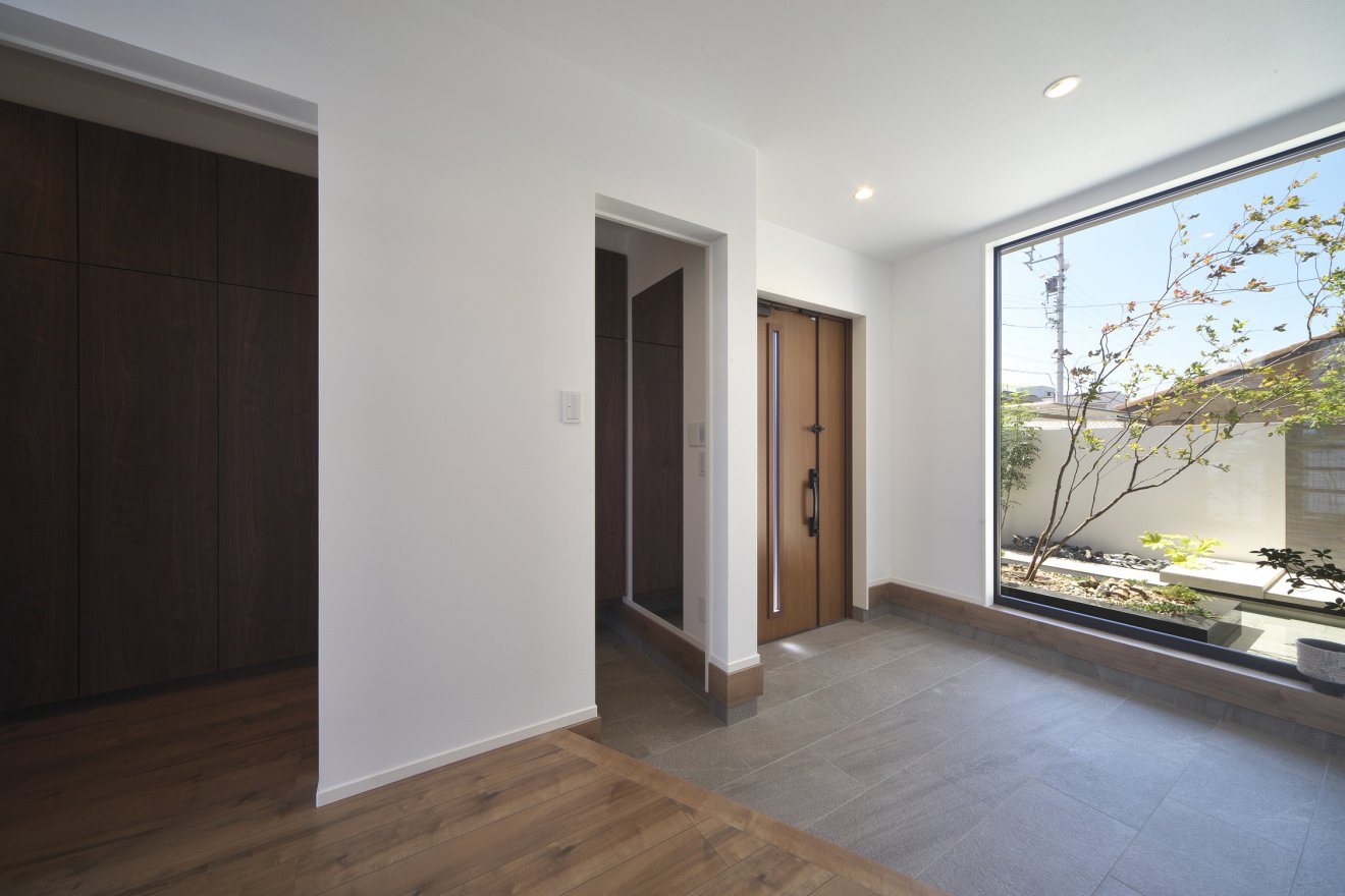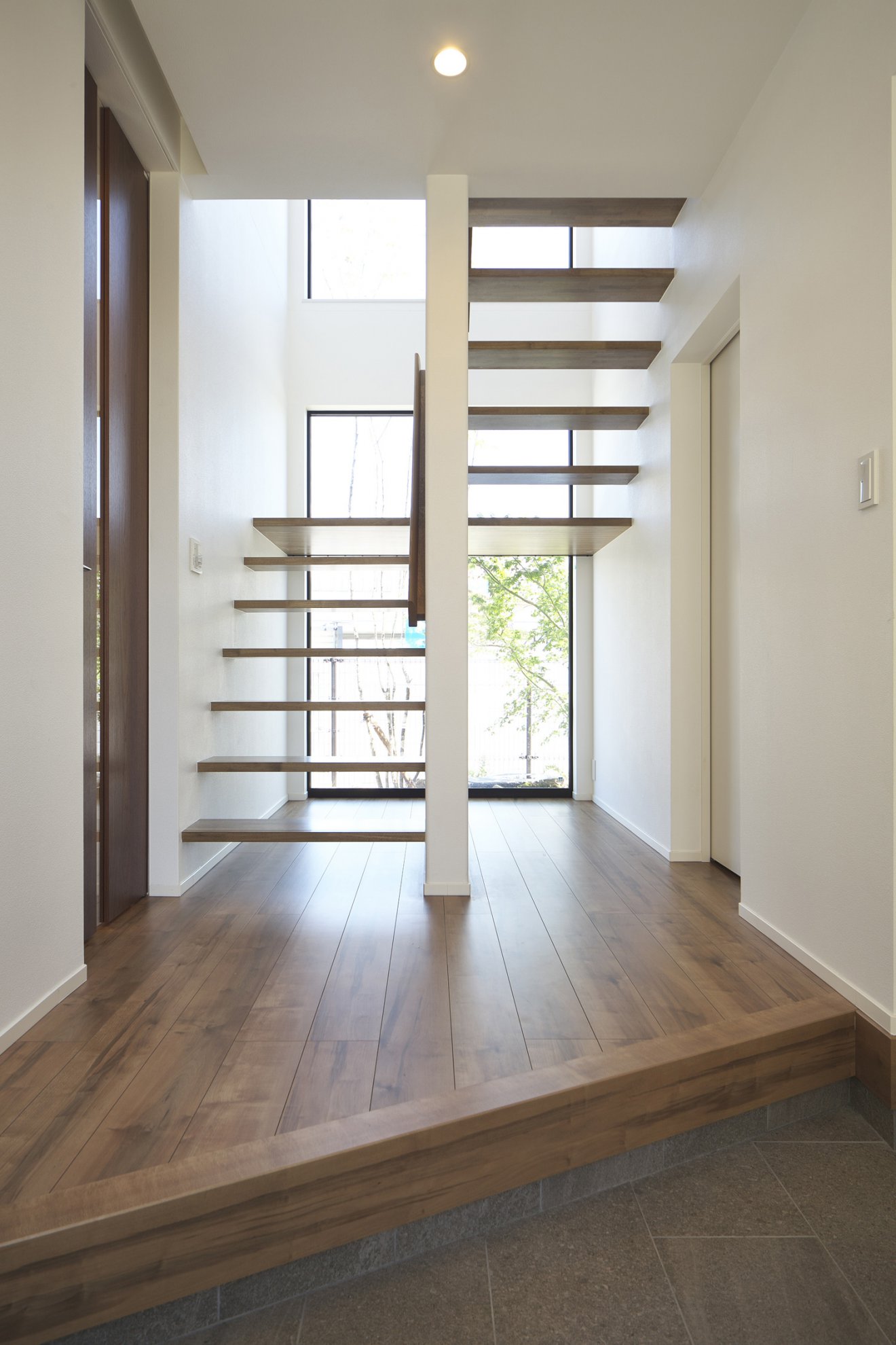 【階段】吹き抜けの階段ホール。スリット階段を採用し、庭木も楽しめます。右側は全面がシューズクロークで大収納です。 【玄関ホール】ホテルライクのような大きな窓で明るい玄関ホールを演出します。