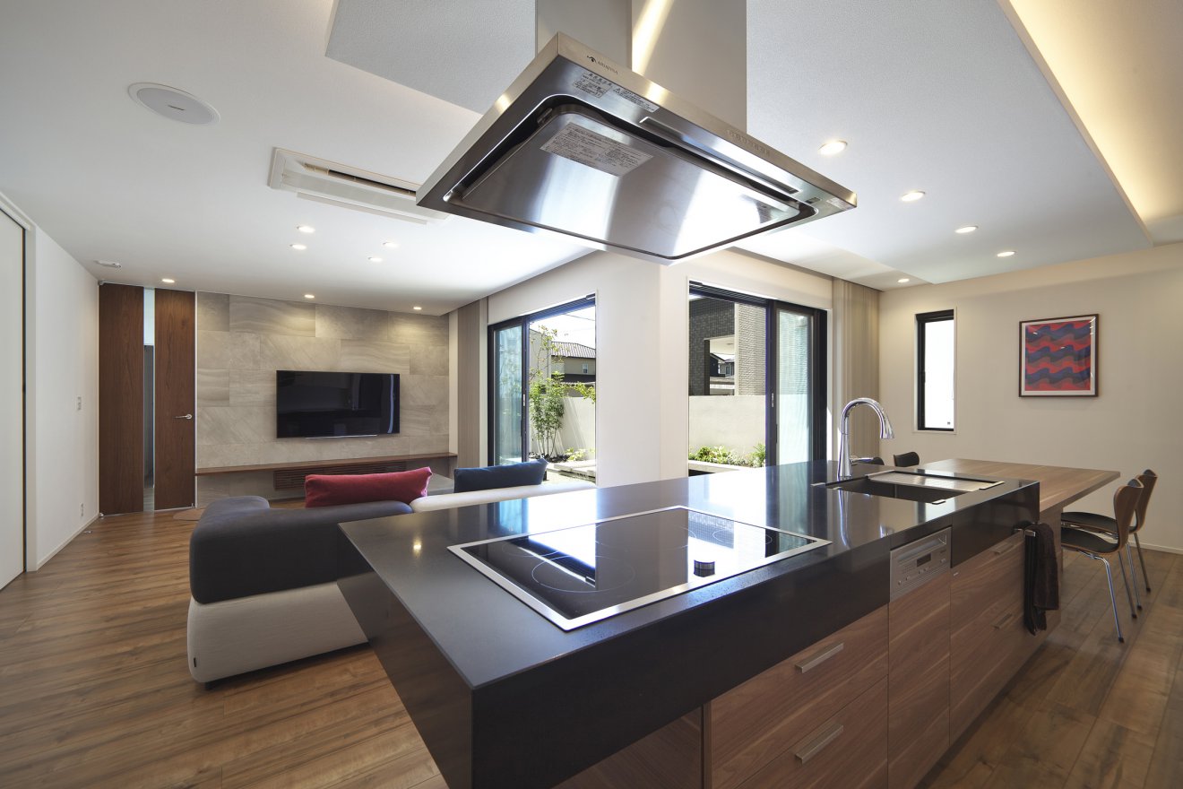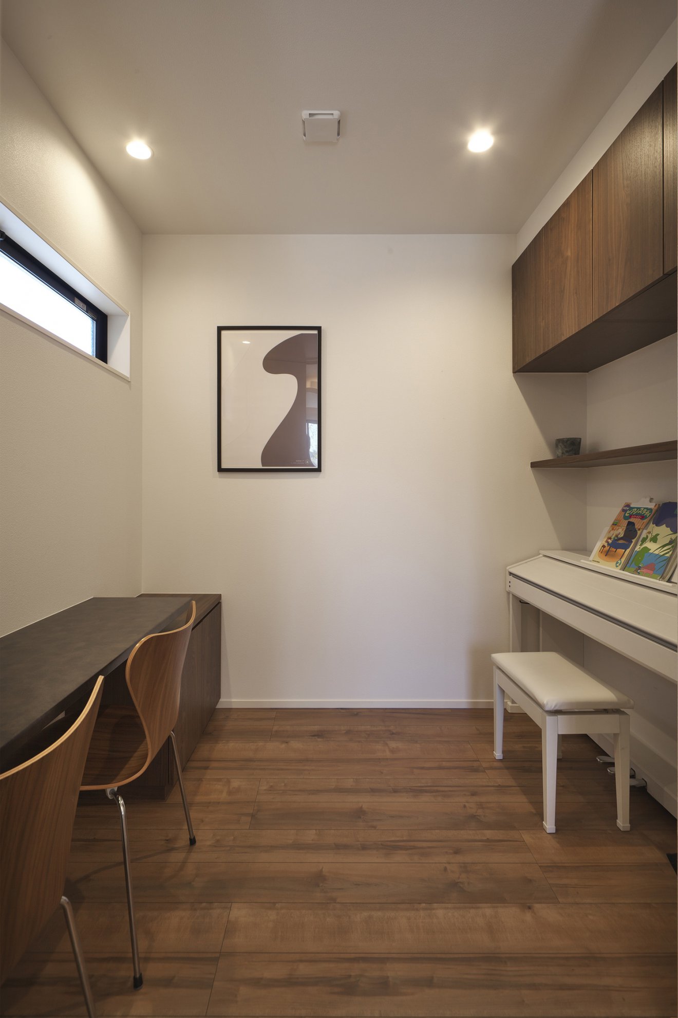 【カウンター】ピアノを設置したスタディルーム。吊り戸棚もあり、床上スッキリ片付きます。 【DK】オーダーのオリジナルキッチンは、テーブルも一体型でスッキリ。LDKの周囲に合わせて、無駄のない家事動線になります。