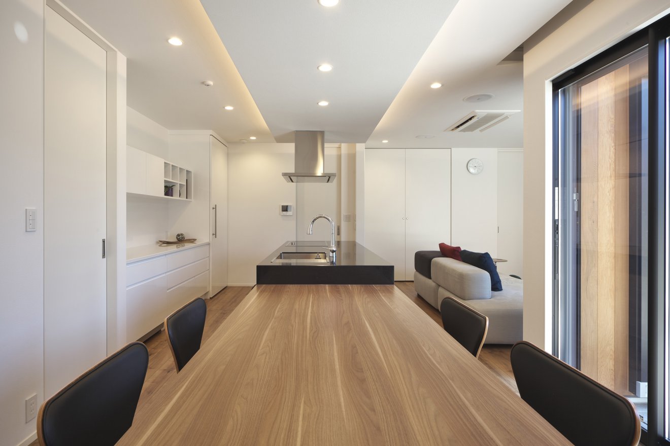 【LDK】テーブル一体型のアイランドタイプキッチンにしました。天井にスピーカーを埋め込み、BGMも楽めます。 【DK】清潔感あふれる白い背面収納は、カウンターの奥行きがありとても使いやすく、食卓も横並びでなのでテーブルセッティングもスムーズです。