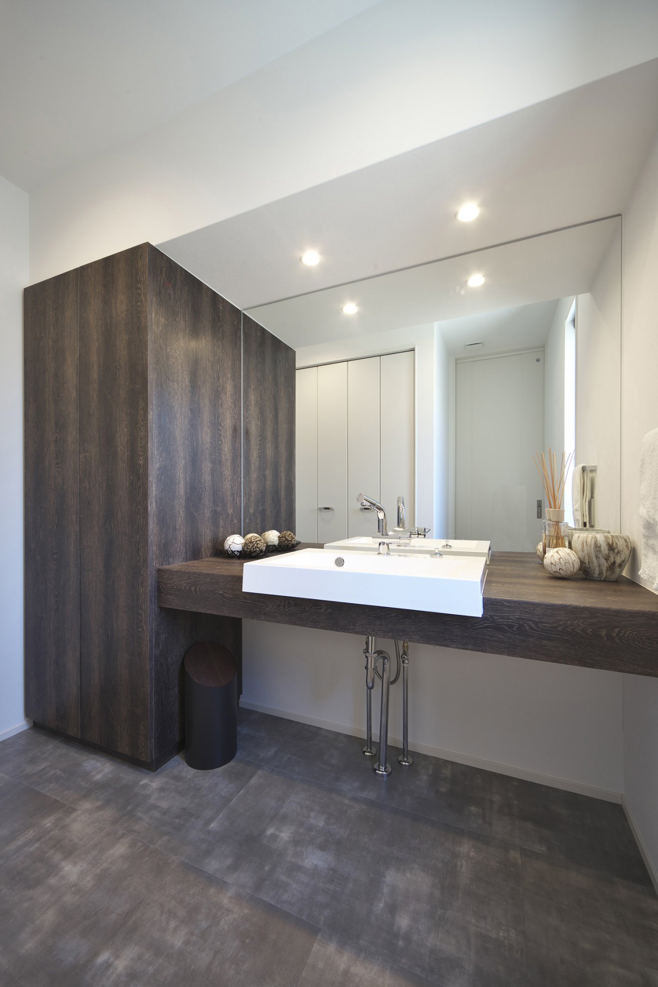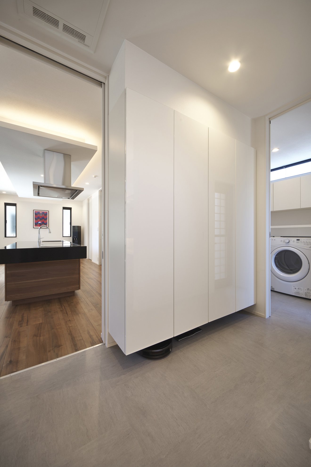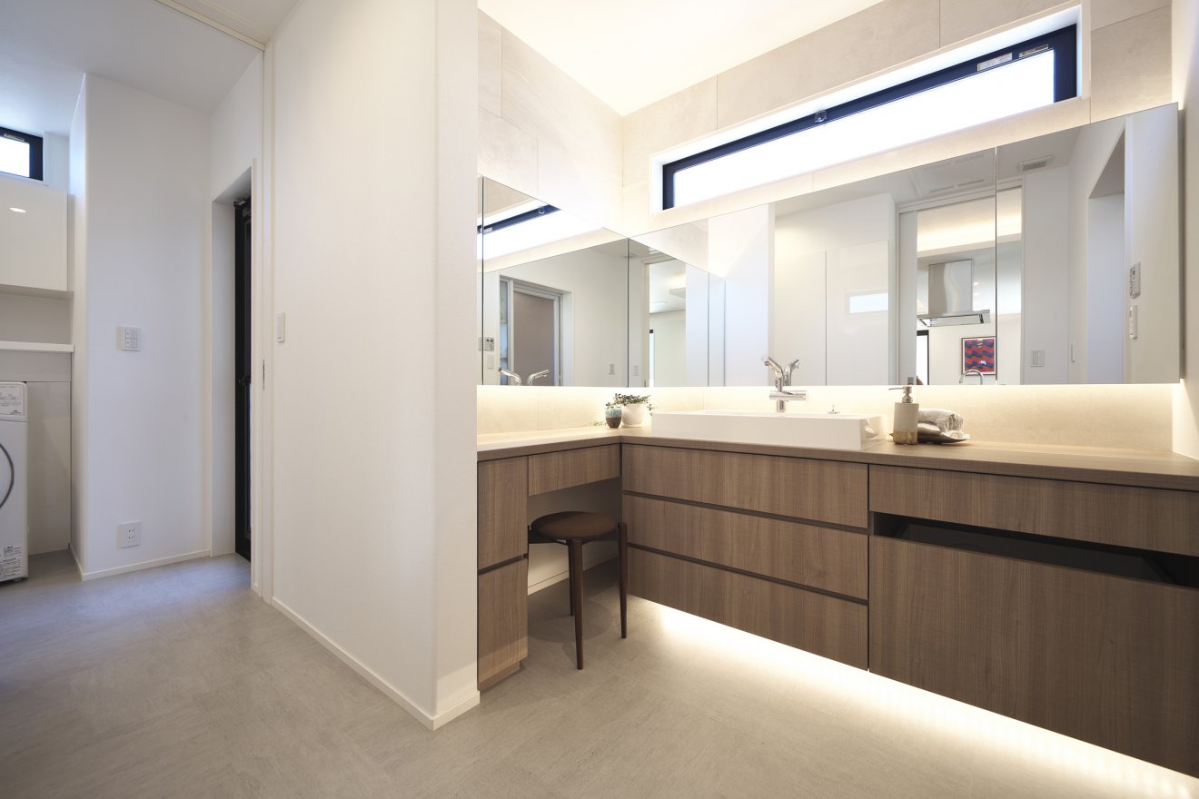 【洗面化粧台】L字型に設置した洗面化粧台。間接照明を採用し光が全体的に拡散し明るいスペースに。右のカウンター下はランドリーボックスを設置しました。 【ユーティリティスペース】洗面脱衣室には、たっぷり入る大きな収納棚。下部には、お掃除ロボットもスタンバイしています。
