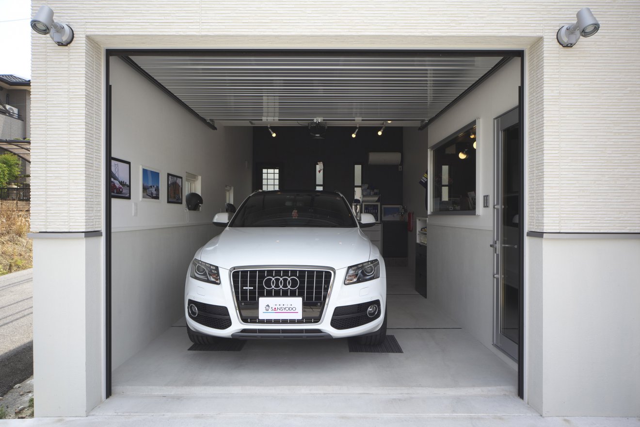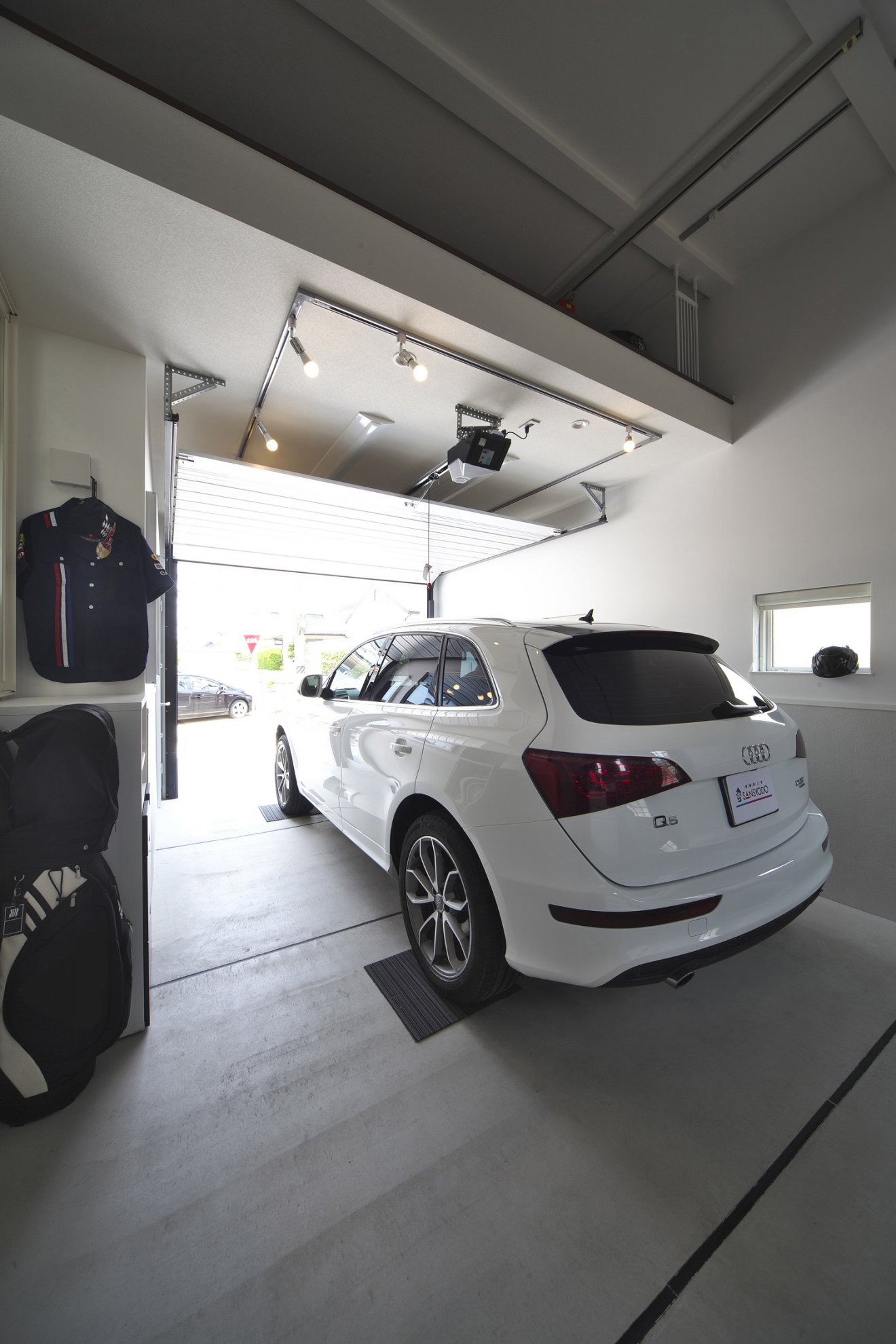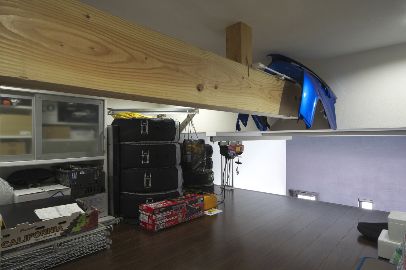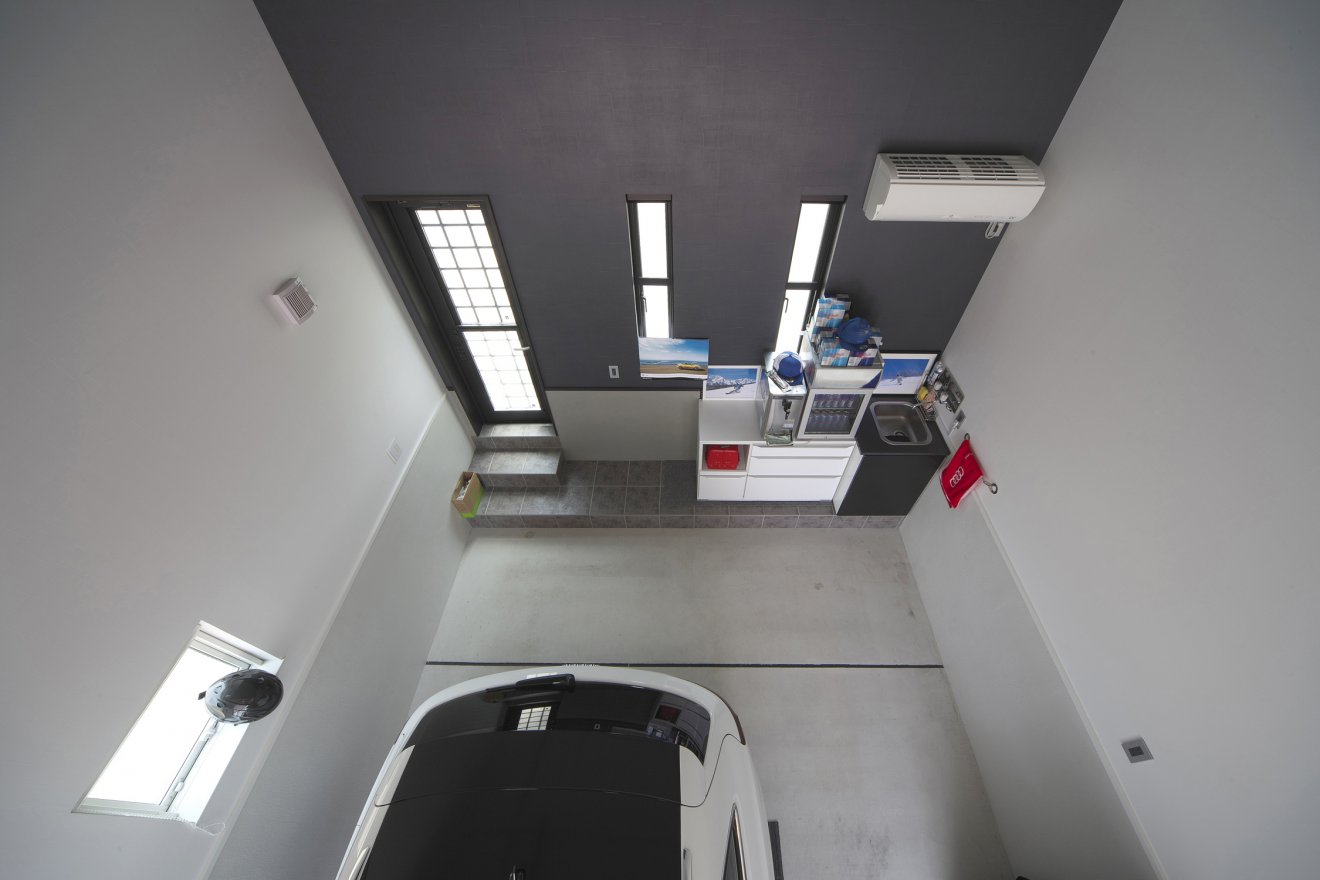 【小屋裏収納】タイヤなどの重量のあるものも収納可能なシャッター上部の小屋裏収納。 【ガレージ】DIYなどの作業場としても利用できるガレージ。水仕事にも事欠かないようエアコンも水栓も設置しました。