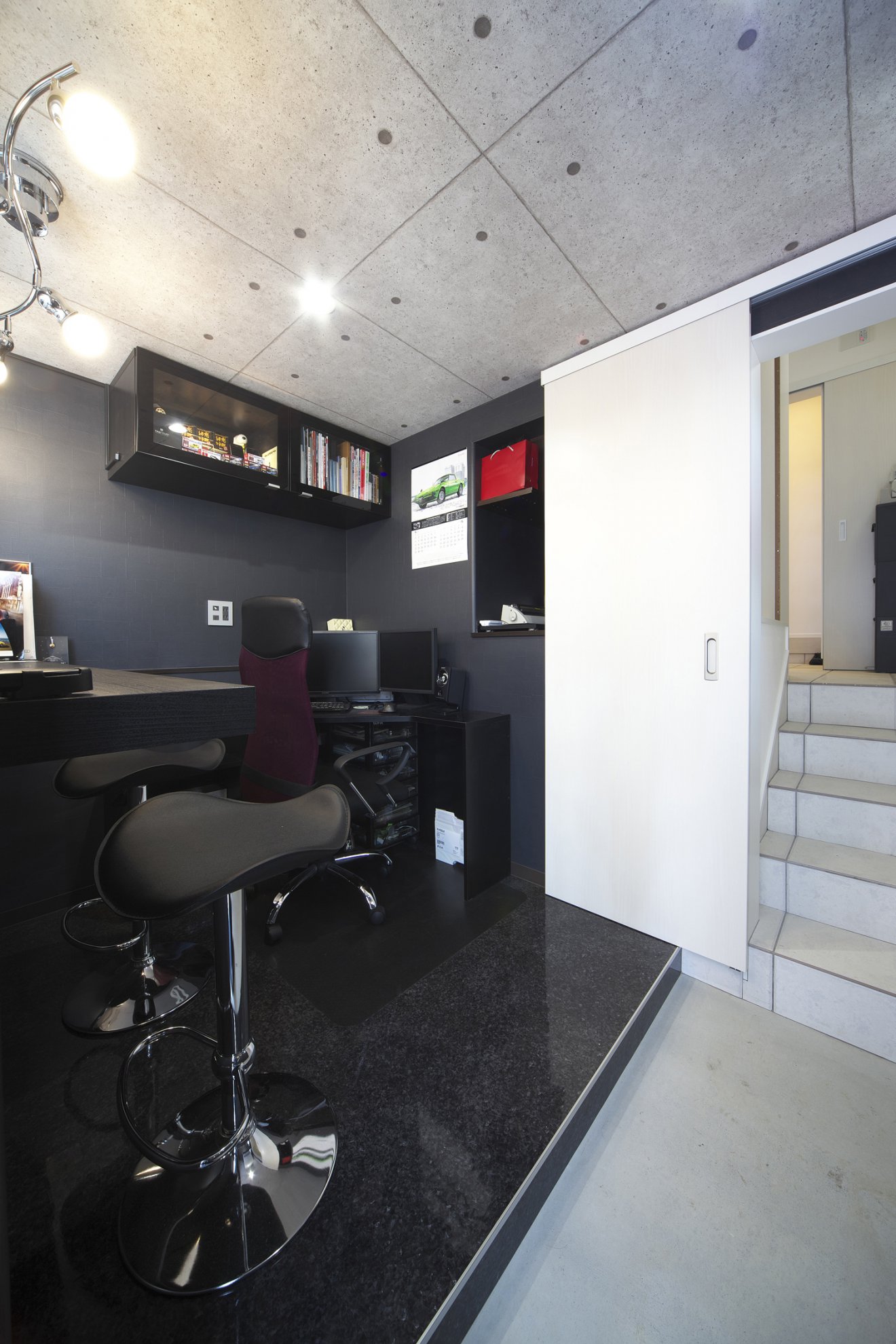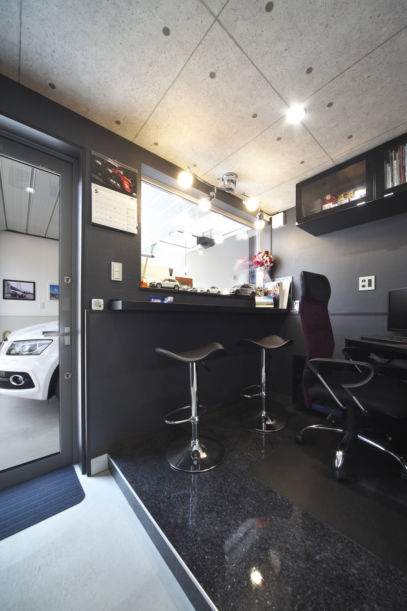 【書斎】ガレージ横の書斎。デスクとカウンターを設置し、車好きの仲間とも愛車談義に花が咲きます。ここなら土足でも大丈夫です。