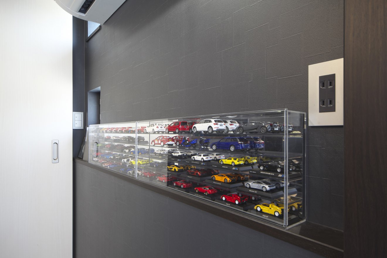 【書斎風景】リビングからガレージ横の書斎へつながる階段。 【書斎風景】コレクションのミニカーのショーケース。