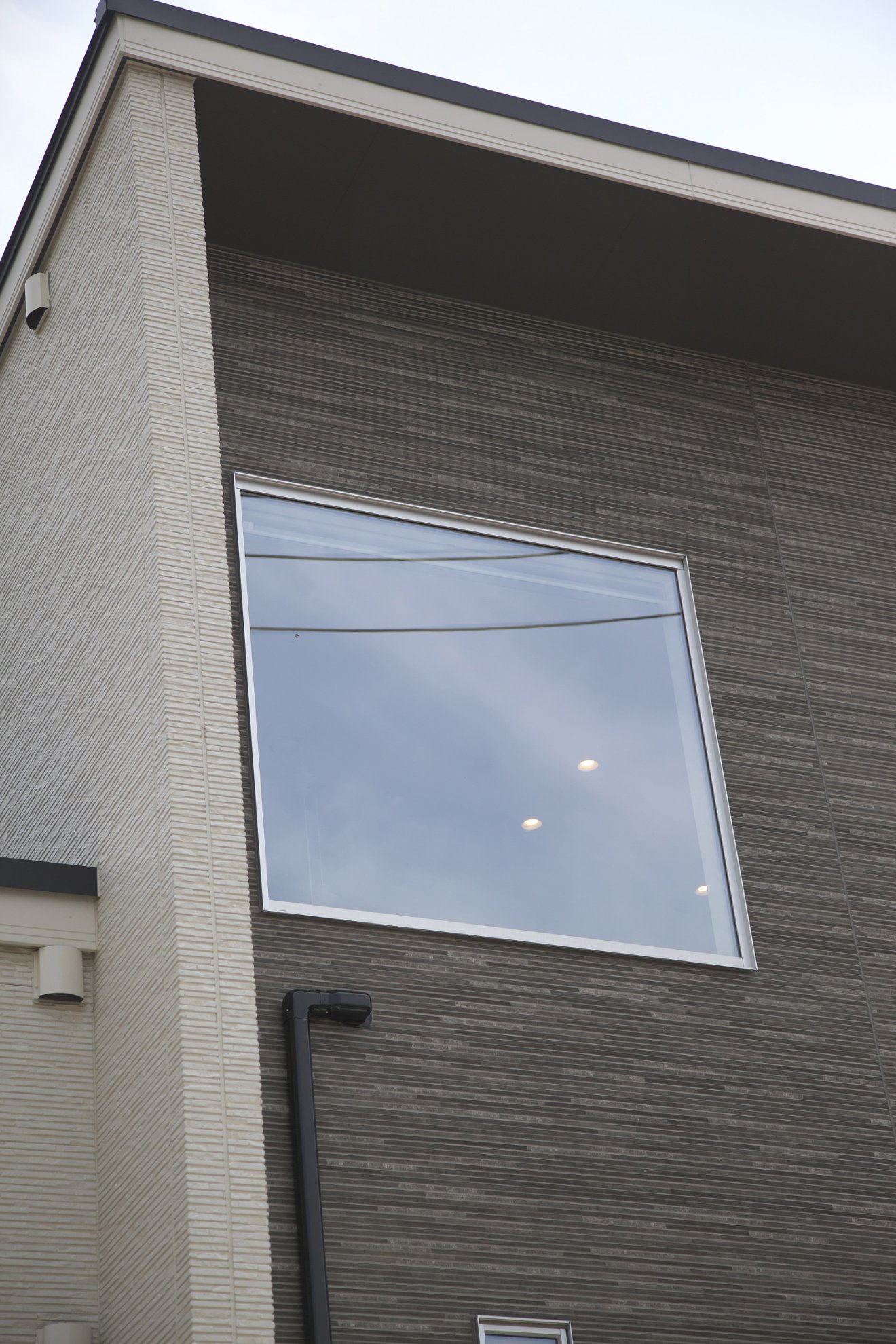 【外観】スクエアな外観に勾配を南に向かって傾斜させた片流れ屋根は、太陽光パネルを搭載。外観に合わせた大小の窓も正方形で統一しました。