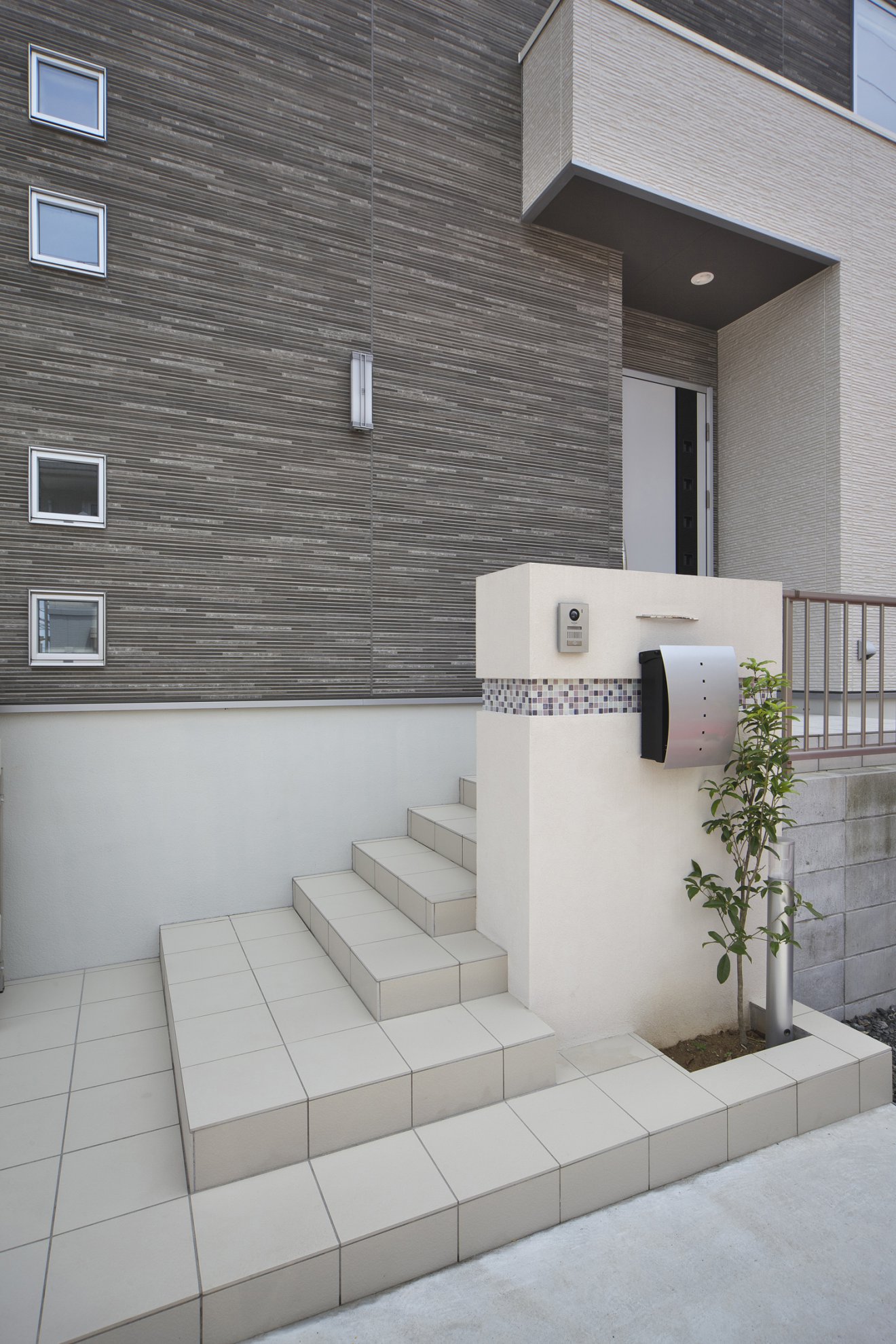 【外観】外観に合わせた正方形の窓も印象的です。 【アプローチ】基礎を高くし数段上がる階段で、外部からの視線もカットできます。