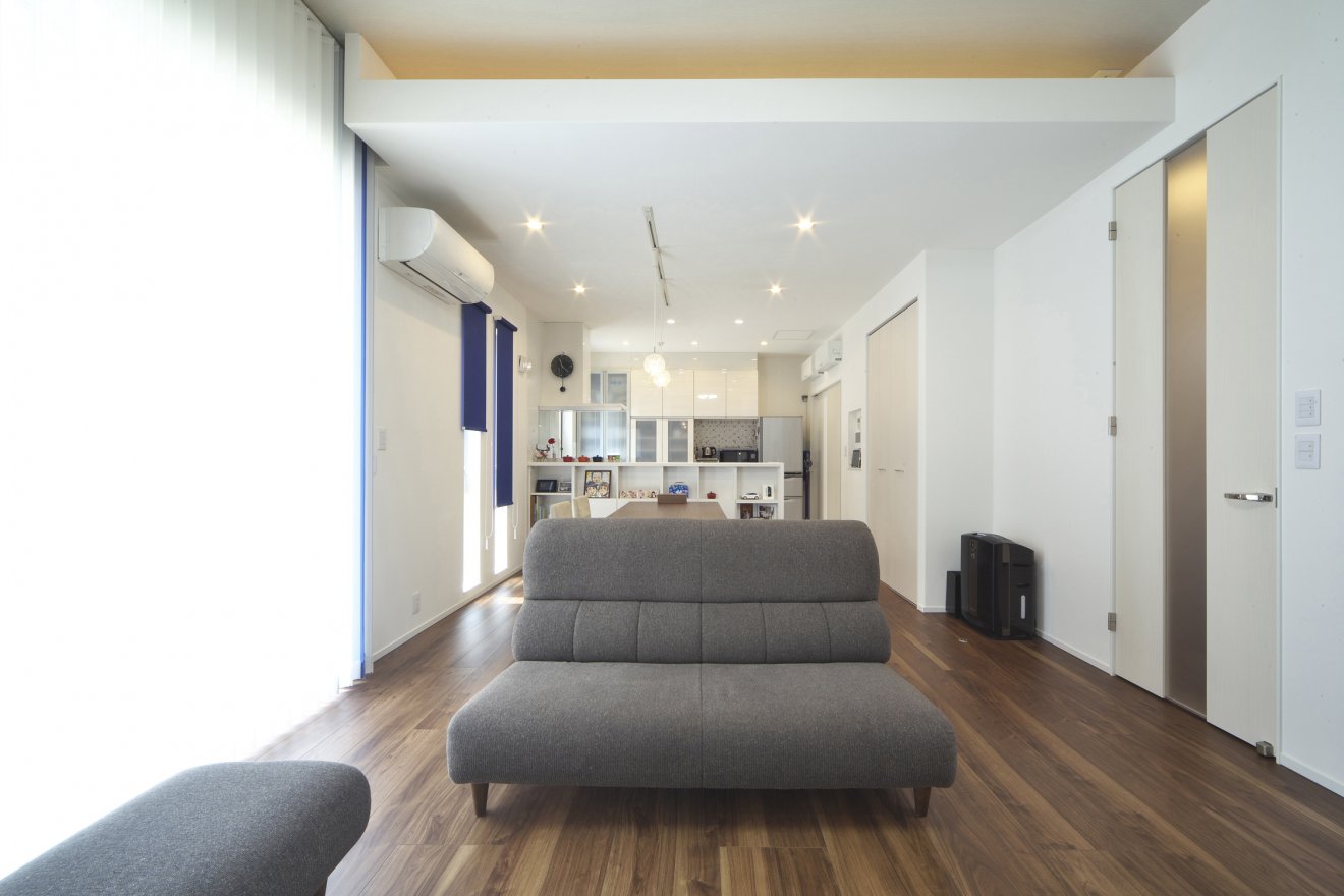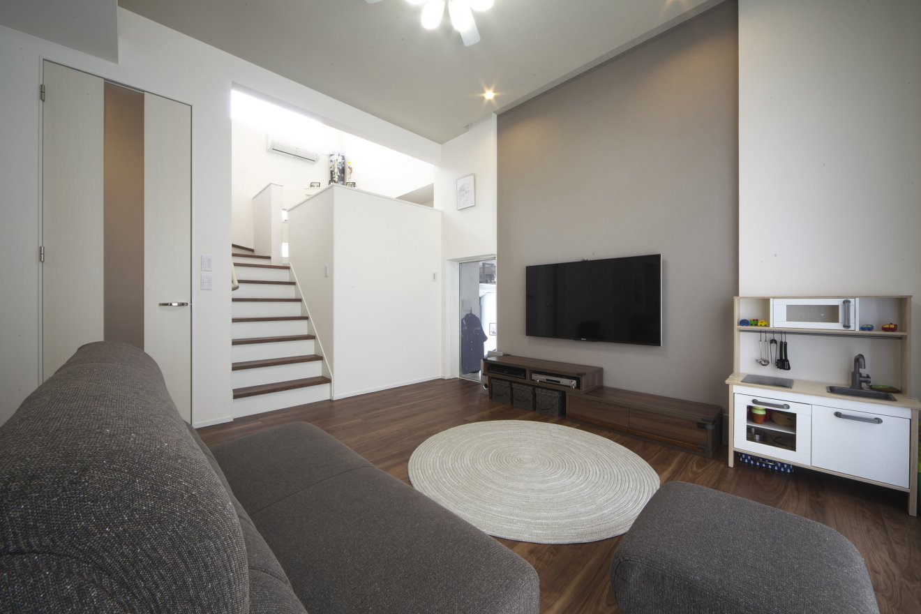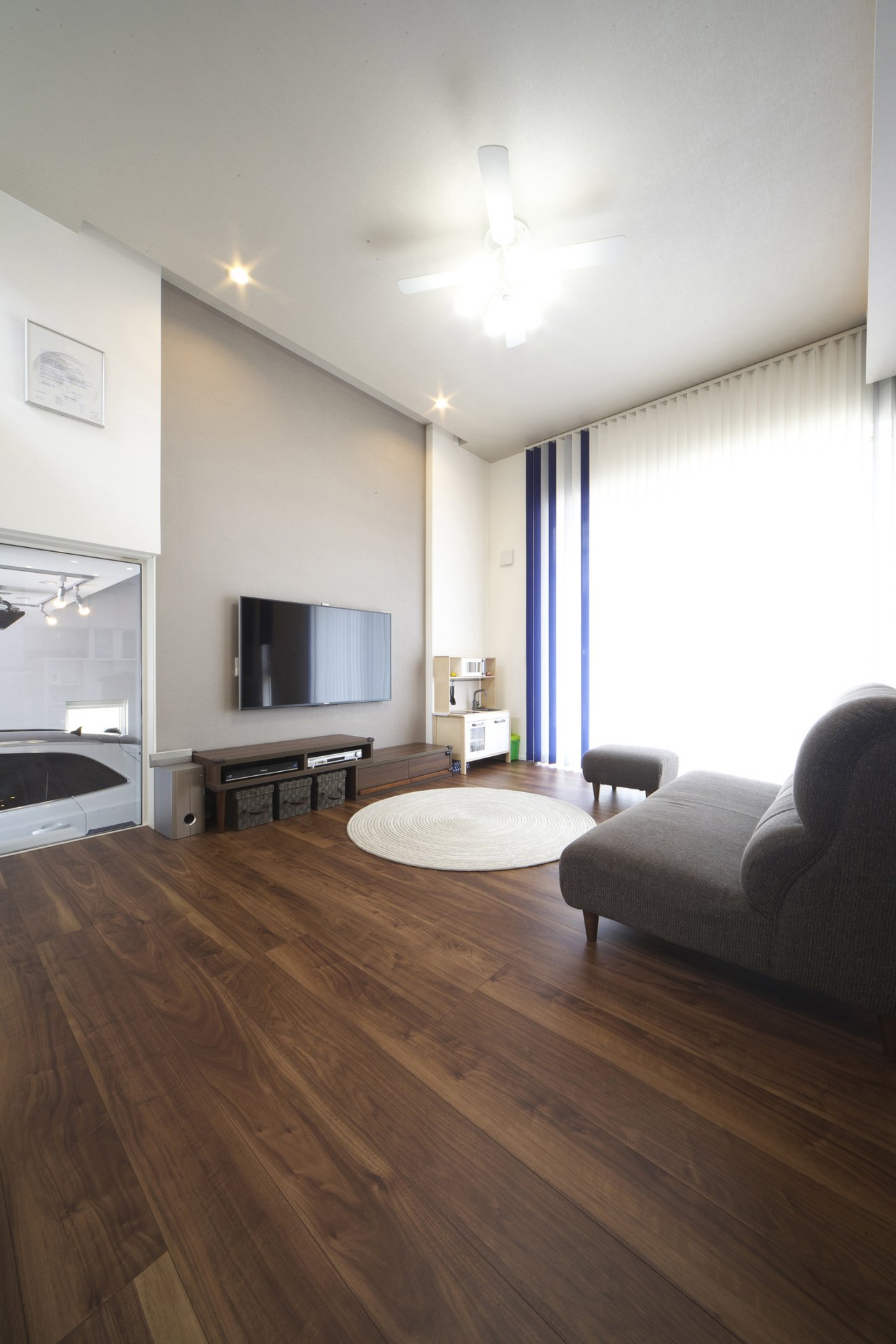 【リビング】愛車を眺めてのんびりと出来るリビング。同じ1階ながら床高の違いが分かります。TV背面の壁も天井まであり、スッキリとしたデザインにしました。