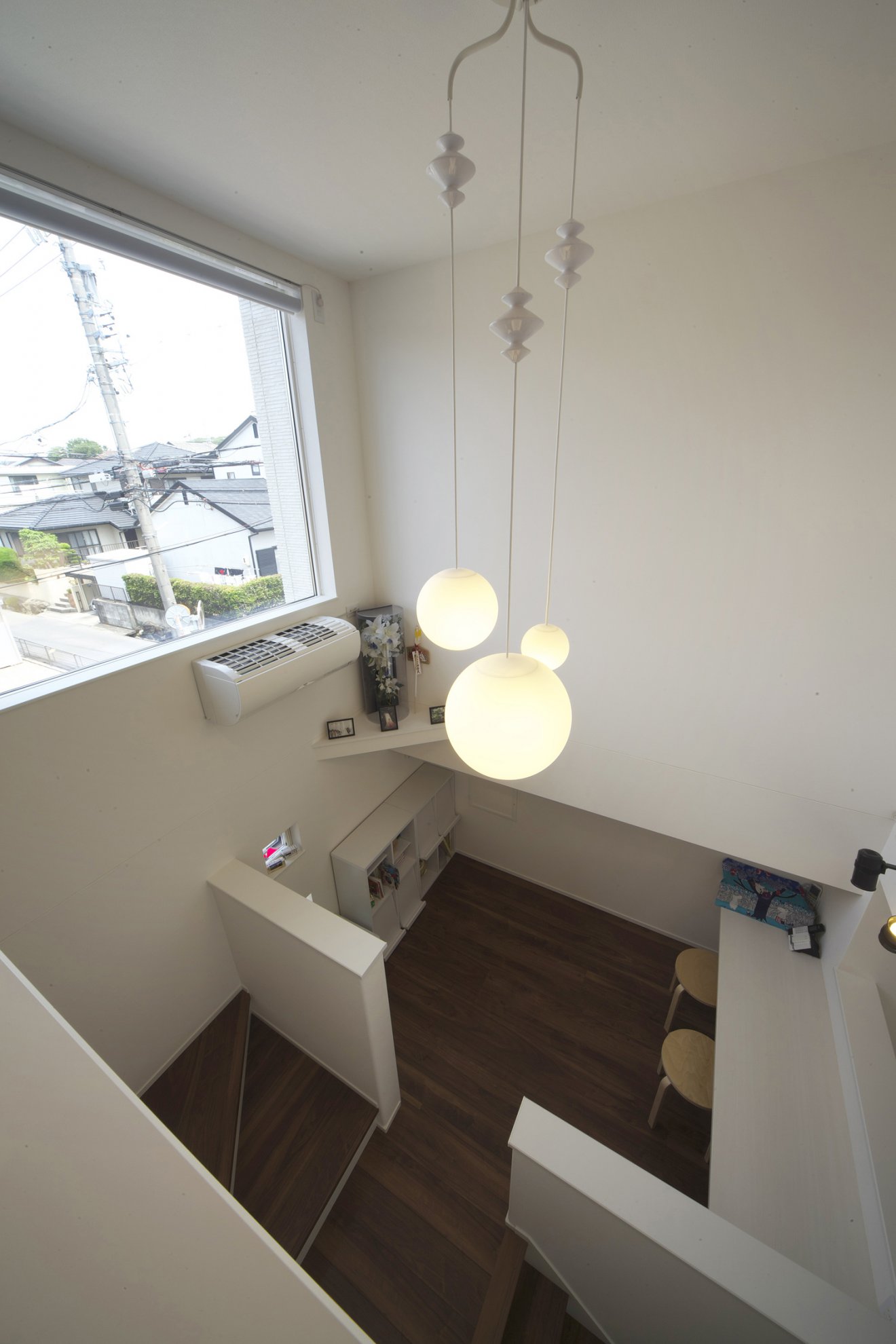 【フリースペース】階段の途中にフリースペースを配置。カウンターを設け、スタディルームとして活用できるようにしました。その下は床の高さの差を利用した書斎で、ガレージとつながっています。