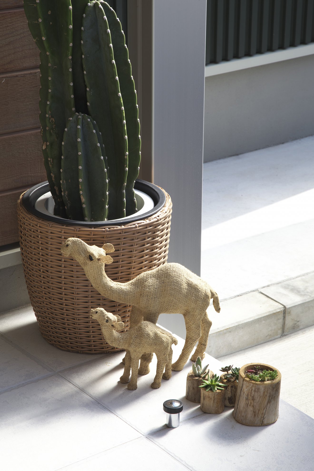 【外観】玄関周りは横張りの木目調でログハウス風に。深いグリーンとホワイトのコントラストが爽やかな森林を思わせる外観です。