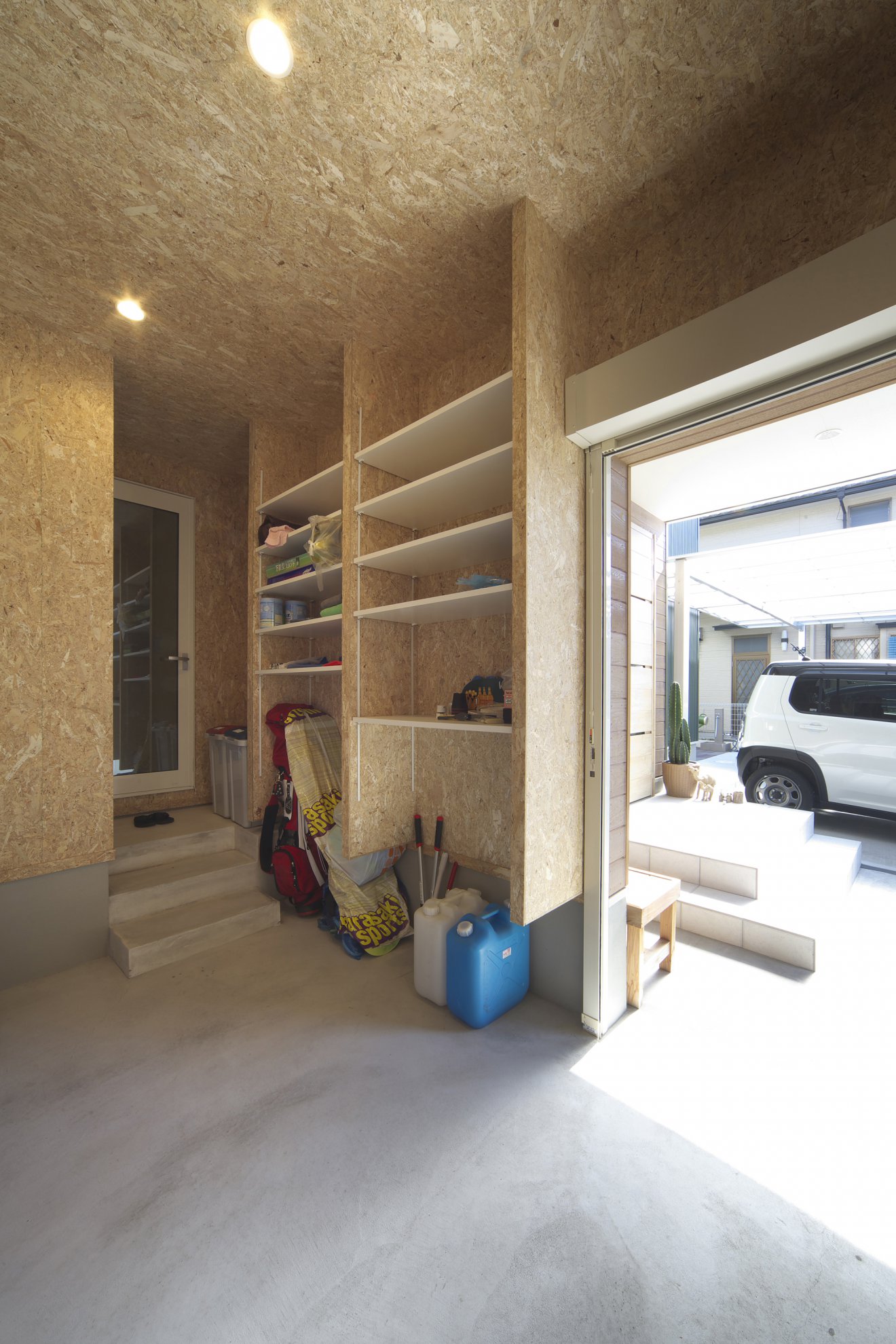 【倉庫】倉庫部分の壁面・天井には合板材を使用。コスト低減を図りながらも、家全体のナチュラルなイメージを壊さないようにしています。