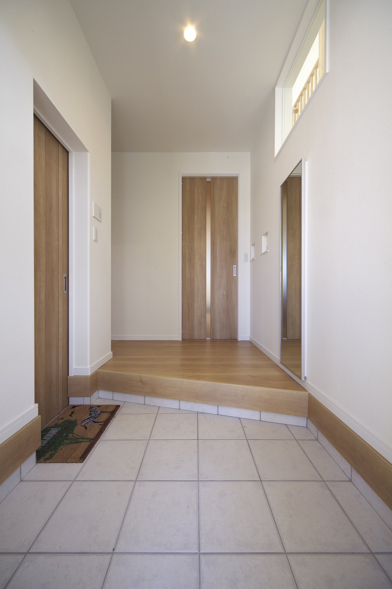 【玄関ホール】左扉の奥はウォークスルータイプのシューズクローク。玄関に家族の靴が散らばらず、生活感を見せない造りです。斜め框と大きな姿見が広がりを感じさせます。
