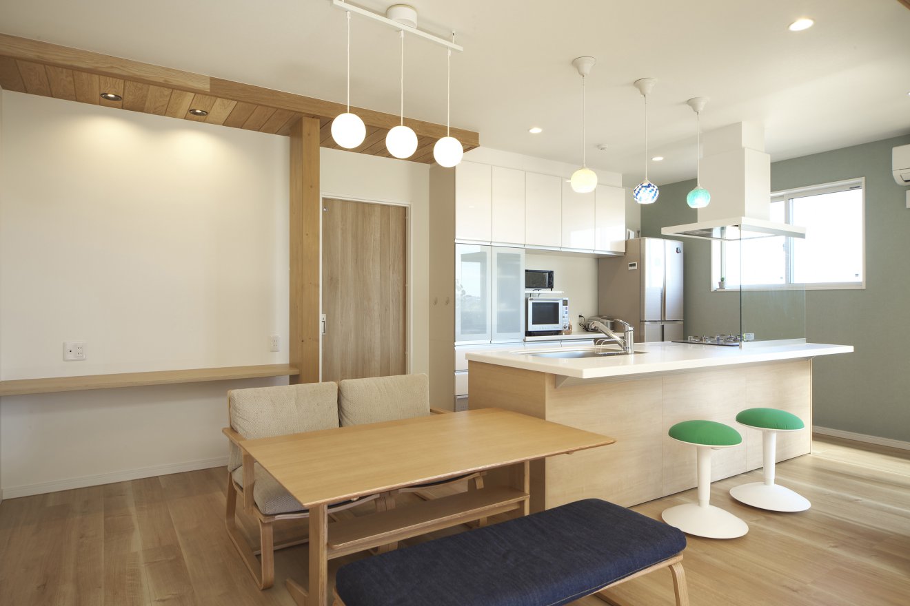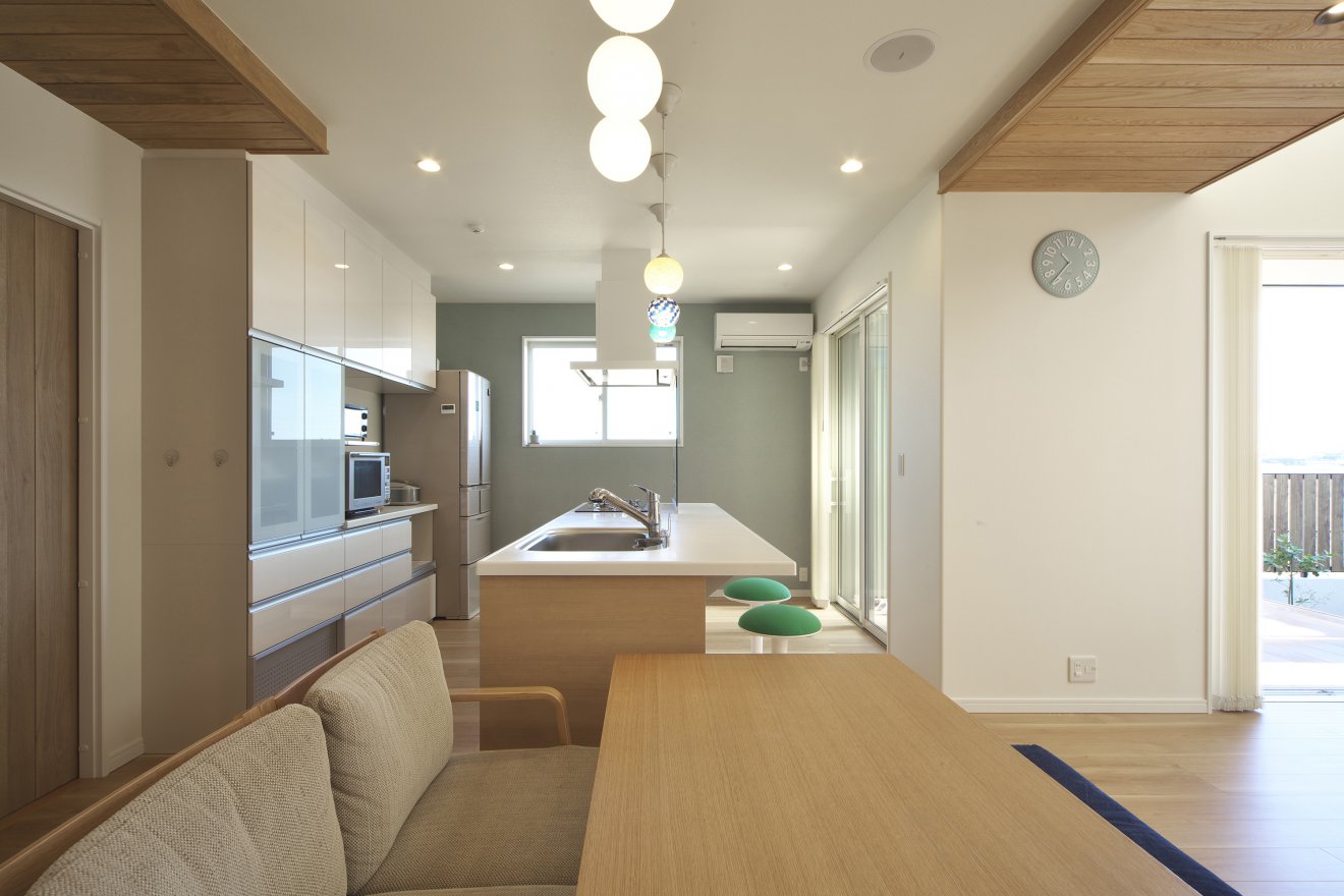 【キッチン】白を基調としたナチュラルデザインのキッチン。アイランドタイプでゆったりと使う事が出来る。背面収納を充実させ、収納の問題も解消しました。