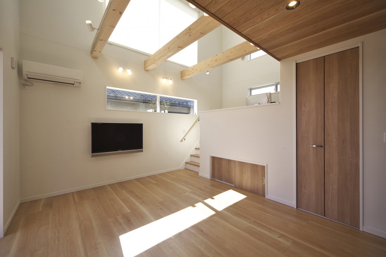 【リビング】吹き抜けの大型窓からたっぷりの光が降り注ぎ、部屋中を明るく照らします。明るく心地よい空間は、光熱費の節約にも一役買っています。