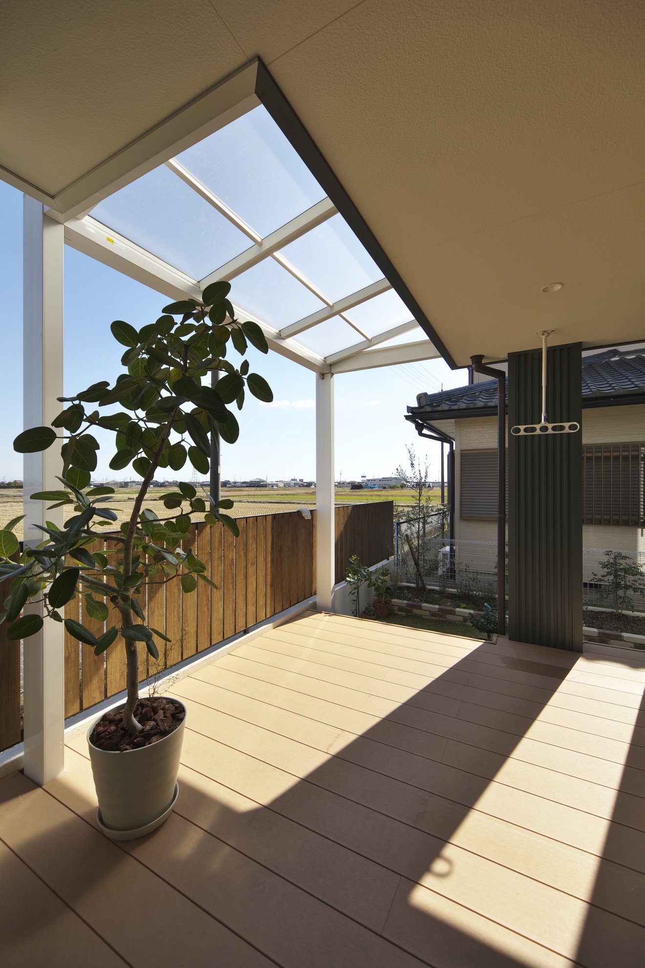 【テラス】バルコニーから屋根を張り出してテラスの奥行きを確保。屋根材をクリアにする事で陽光を取り込めるようにしました。