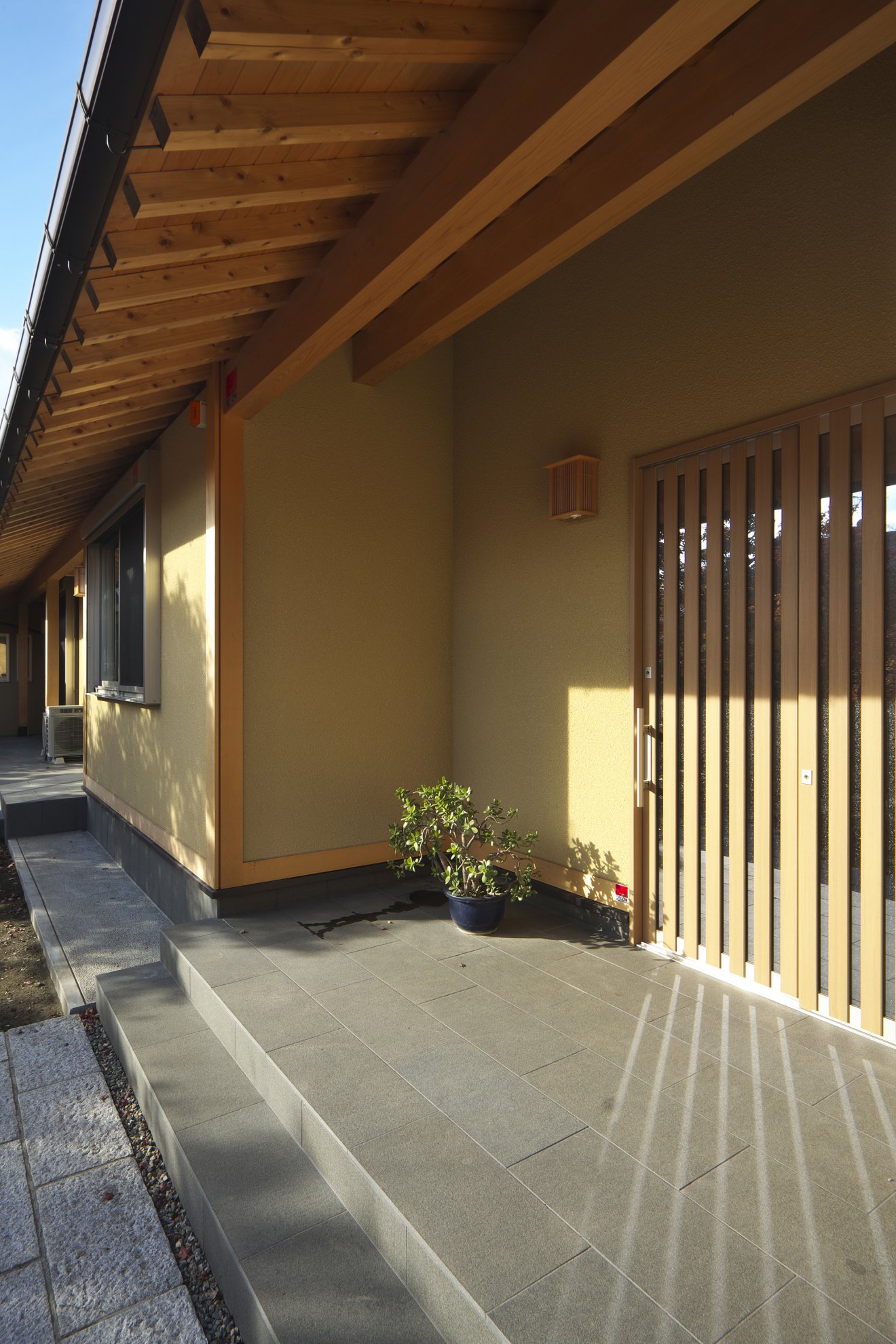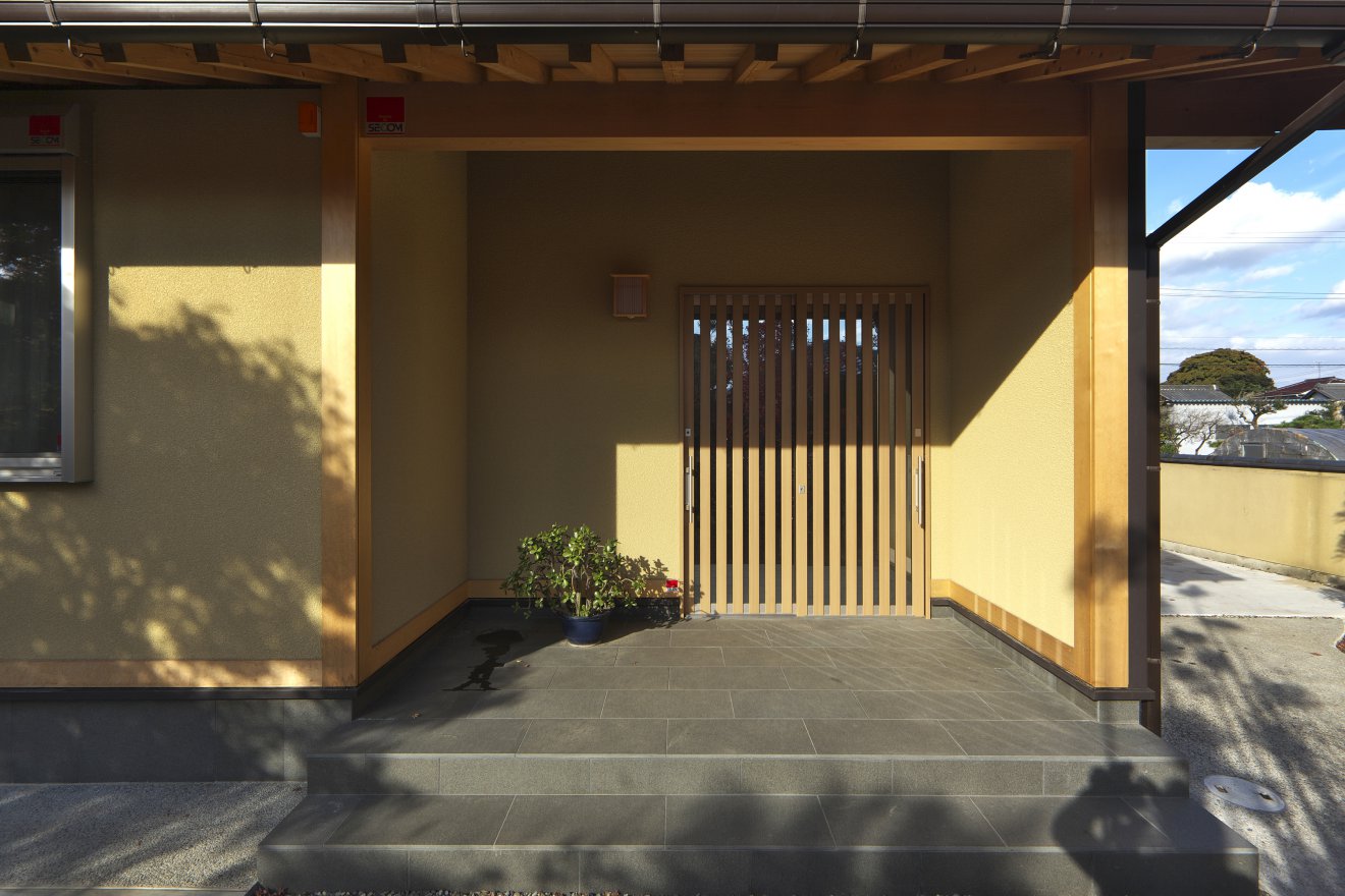 【玄関】玄関は大きく開く引き戸を採用し、軒を深くすることで陽差しをコントロールする日本家屋の良さも取り入れました。