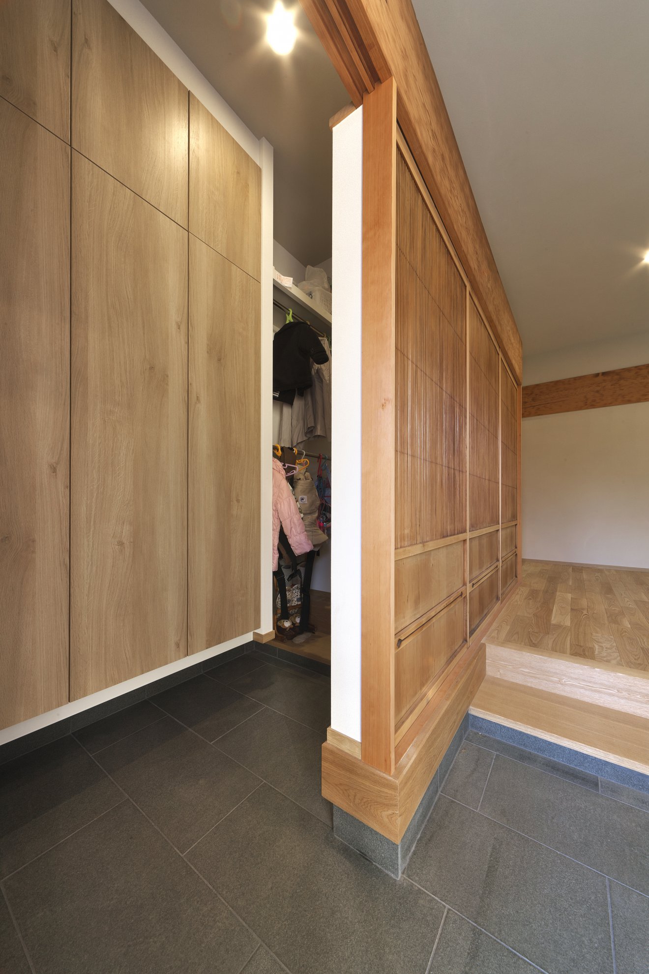 【玄関ホール】木の香りが感じられる玄関。玄関横のシューズクロークは、たっぷり収納できます。