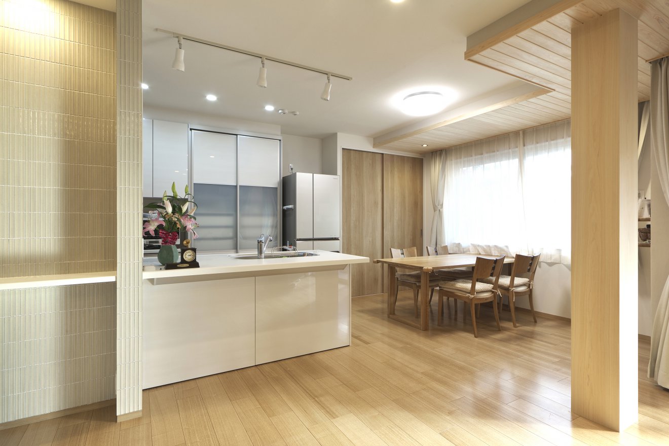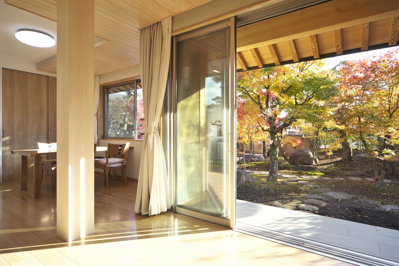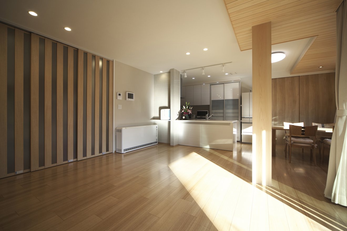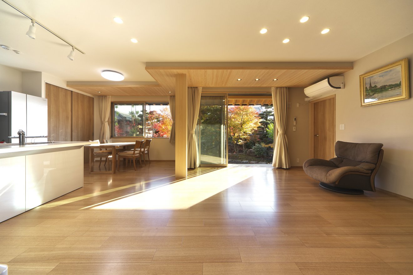 【DK】木の質感漂うリビングからキッチンを臨む。 【リビング】窓も3枚の引き戸を採用して大きく開き、明るさと開放感がUPします。