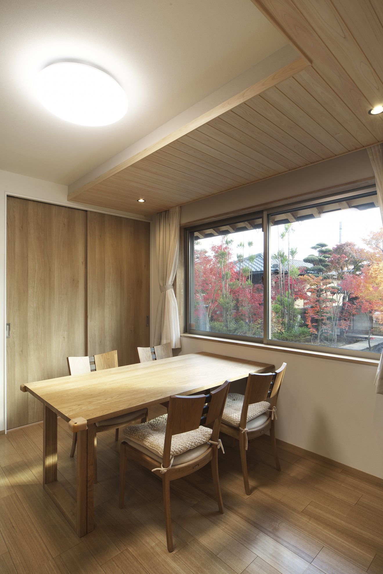 【ダイニング】明るく開放的なダイニング。食卓上の天井に段差をつけ、羽目板をあしらい、木の風合いをプラスしました。