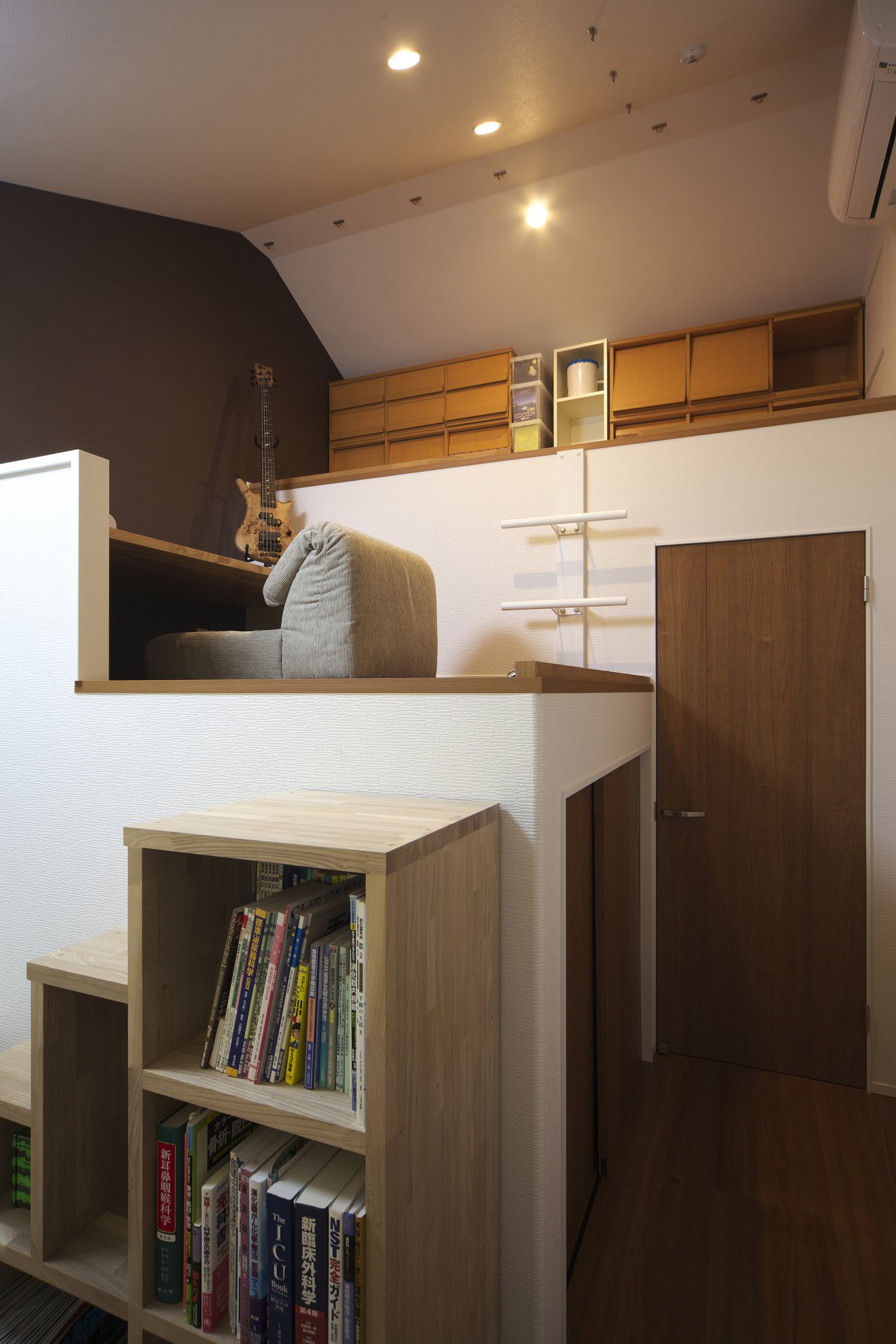 【子供部屋】本棚の階段を上がると、秘密基地のような書斎とロフトへ続きます。