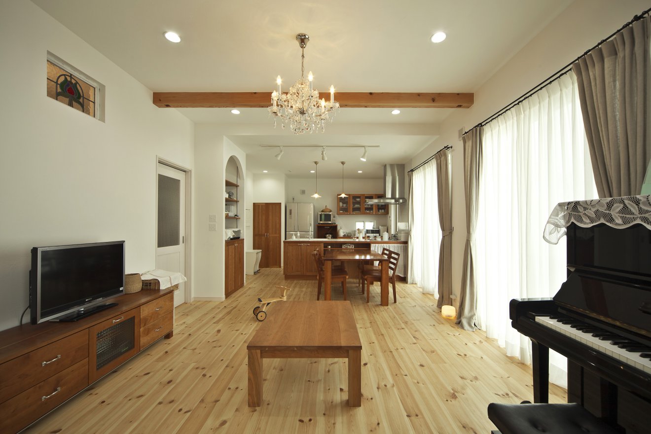 ラップサイディングで表現した優雅さ漂うカントリースタイルの家。無垢材や珪藻土など自然素材をふんだんに採り入れた屋内は、ナチュラルで優しい雰囲気に仕上がりました。ダイニング壁面収納の棚や扉の色・素材感をキッチンと合わせ、DKに一体感を演出。また、天井高の切り替えや化粧梁を施すことで、リビングとの間にゆるやかな変化をつけています。