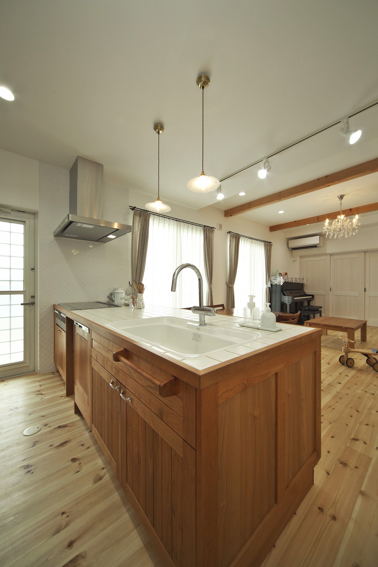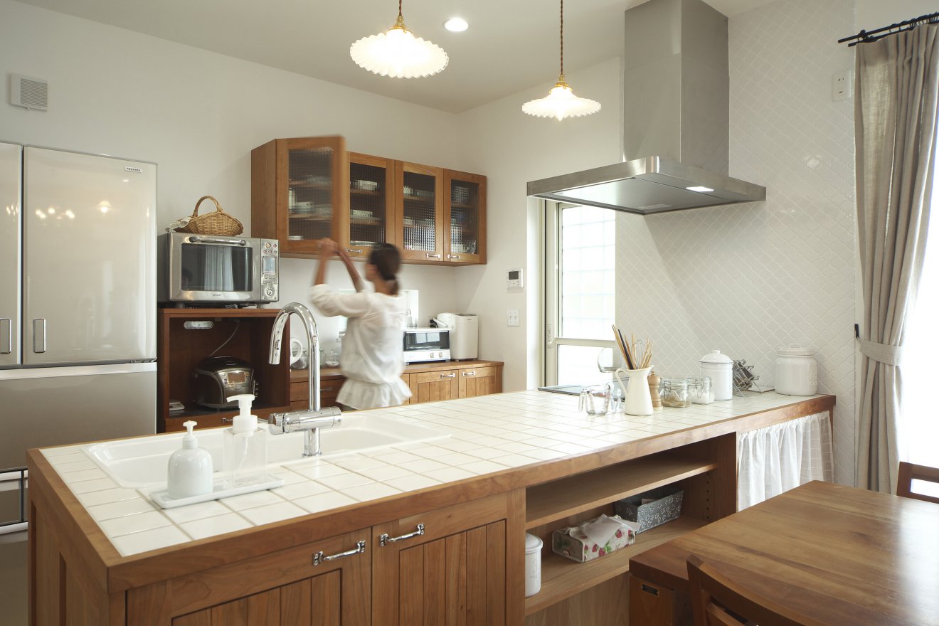 【キッチン】白いタイルが印象的なキッチンは、カントリーテイストで仕上げ、前面は収納たっぷりできます。