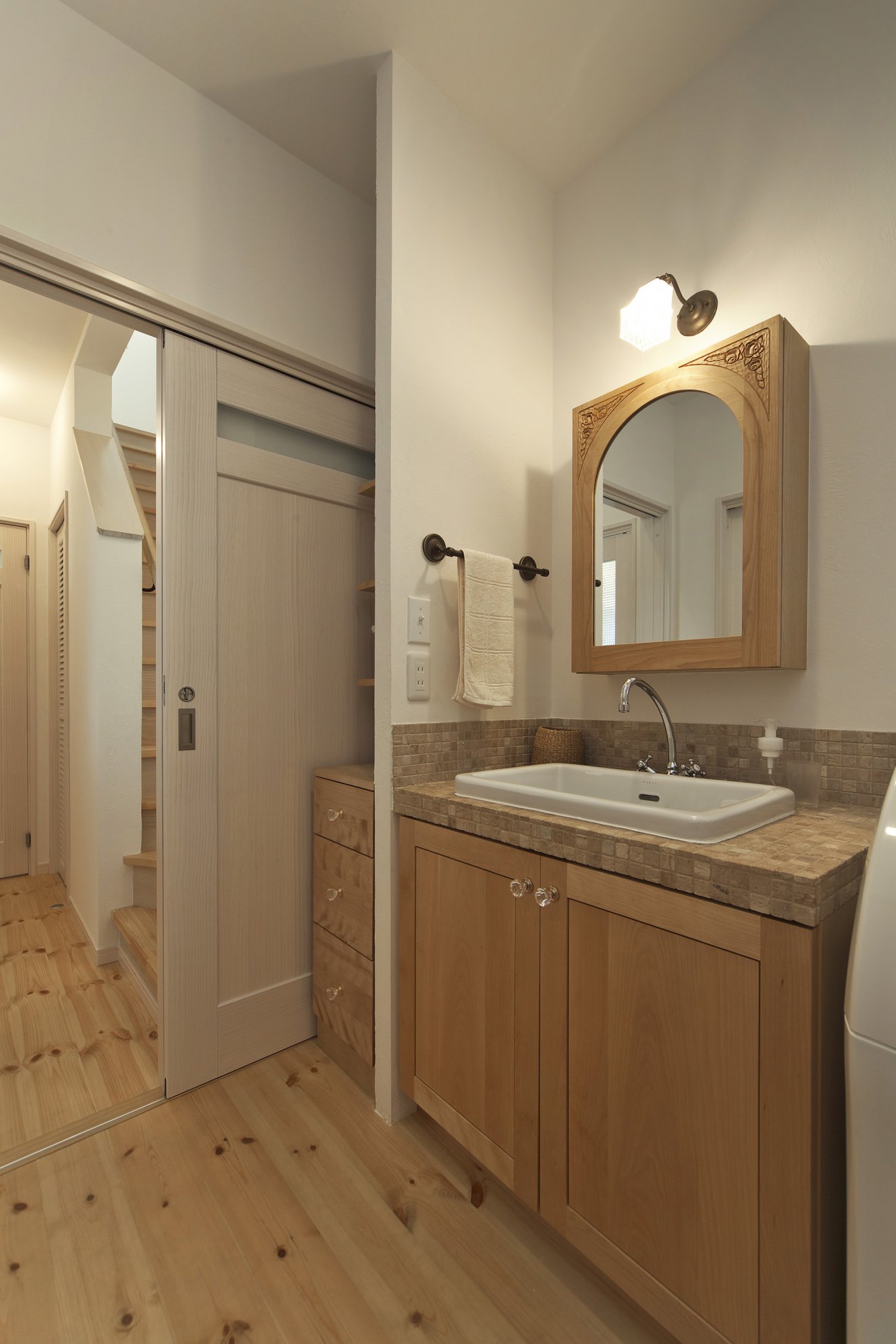 【洗面】タイルやノブにもこだわった洗面台。