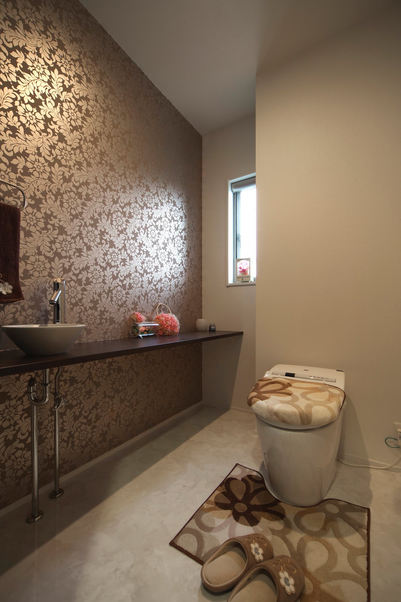 【トイレ】ゆったり広さがあるのトイレは、アクセントクロスでシックな仕上がりにしました。棚もあり、小物も飾れます。