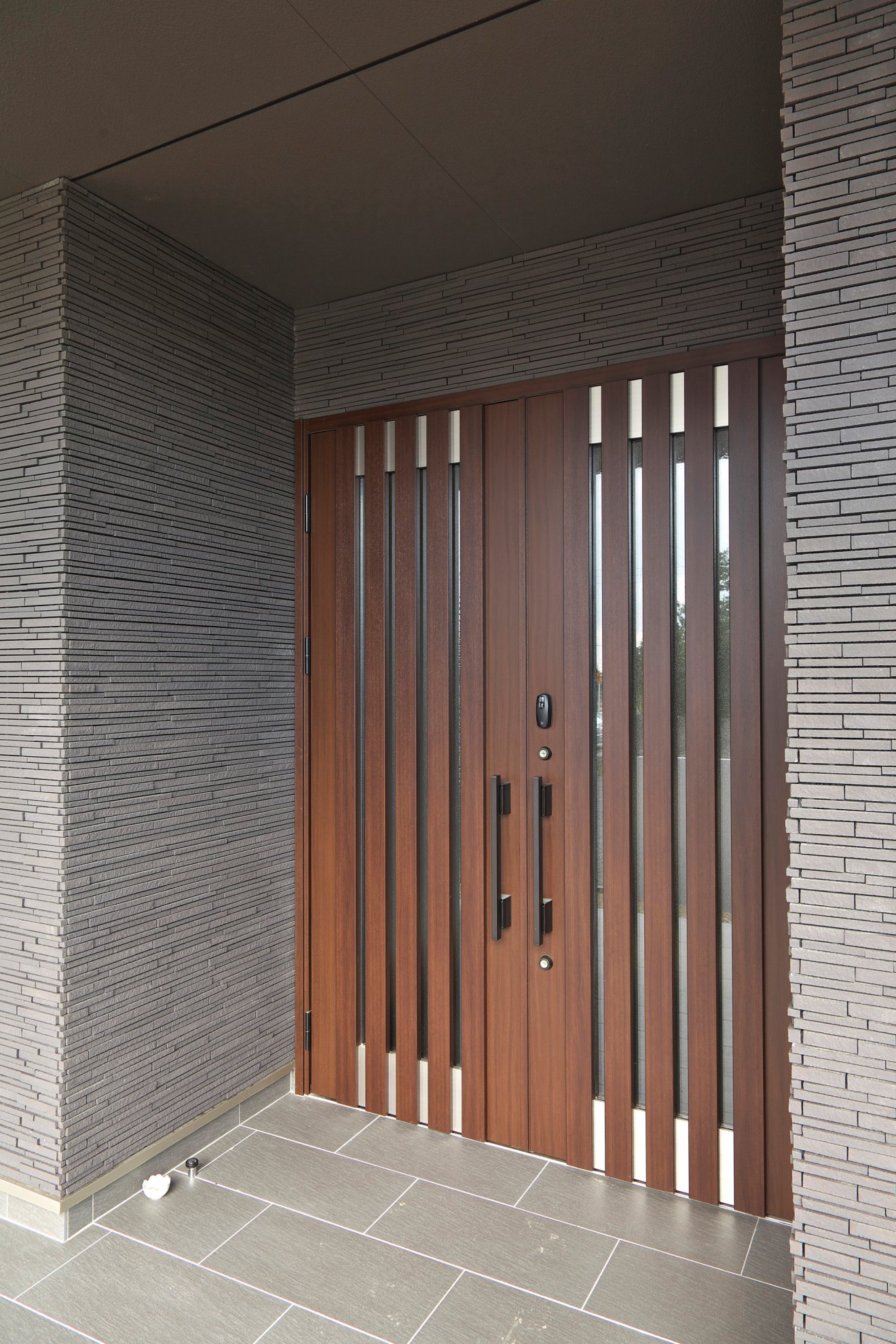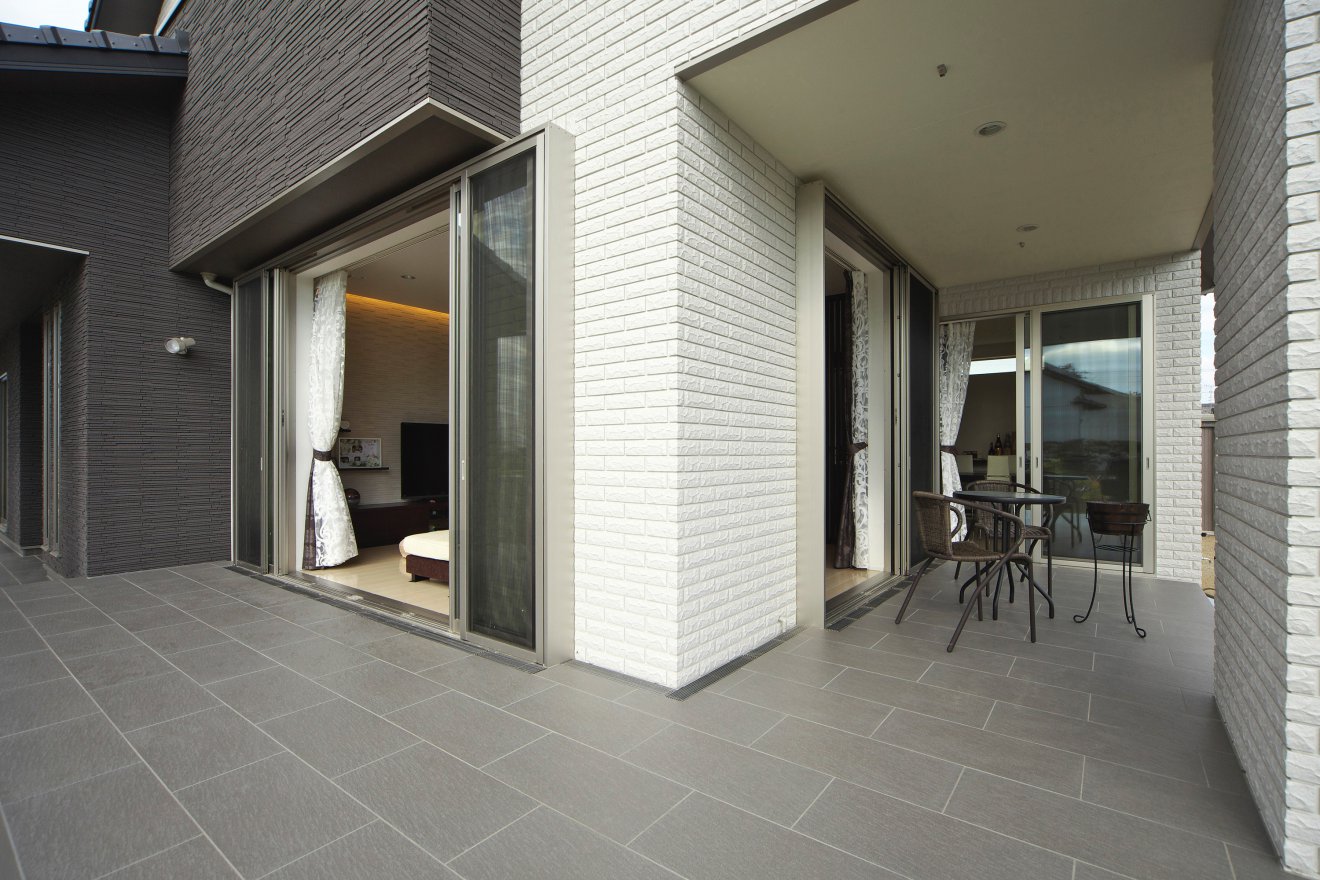 【テラス】外壁にタイルを使い、モノトーンで個性的にしました。 【玄関】左右に大きく開く、玄関ドア。