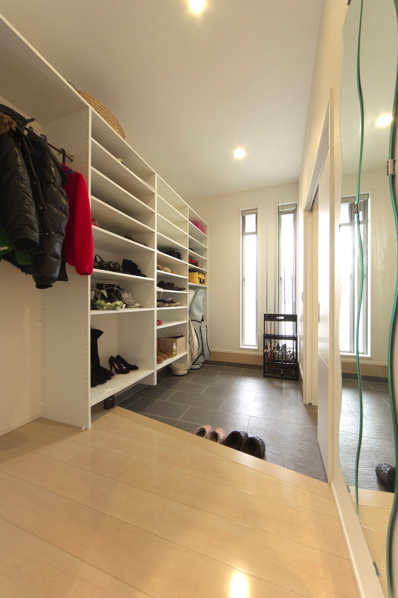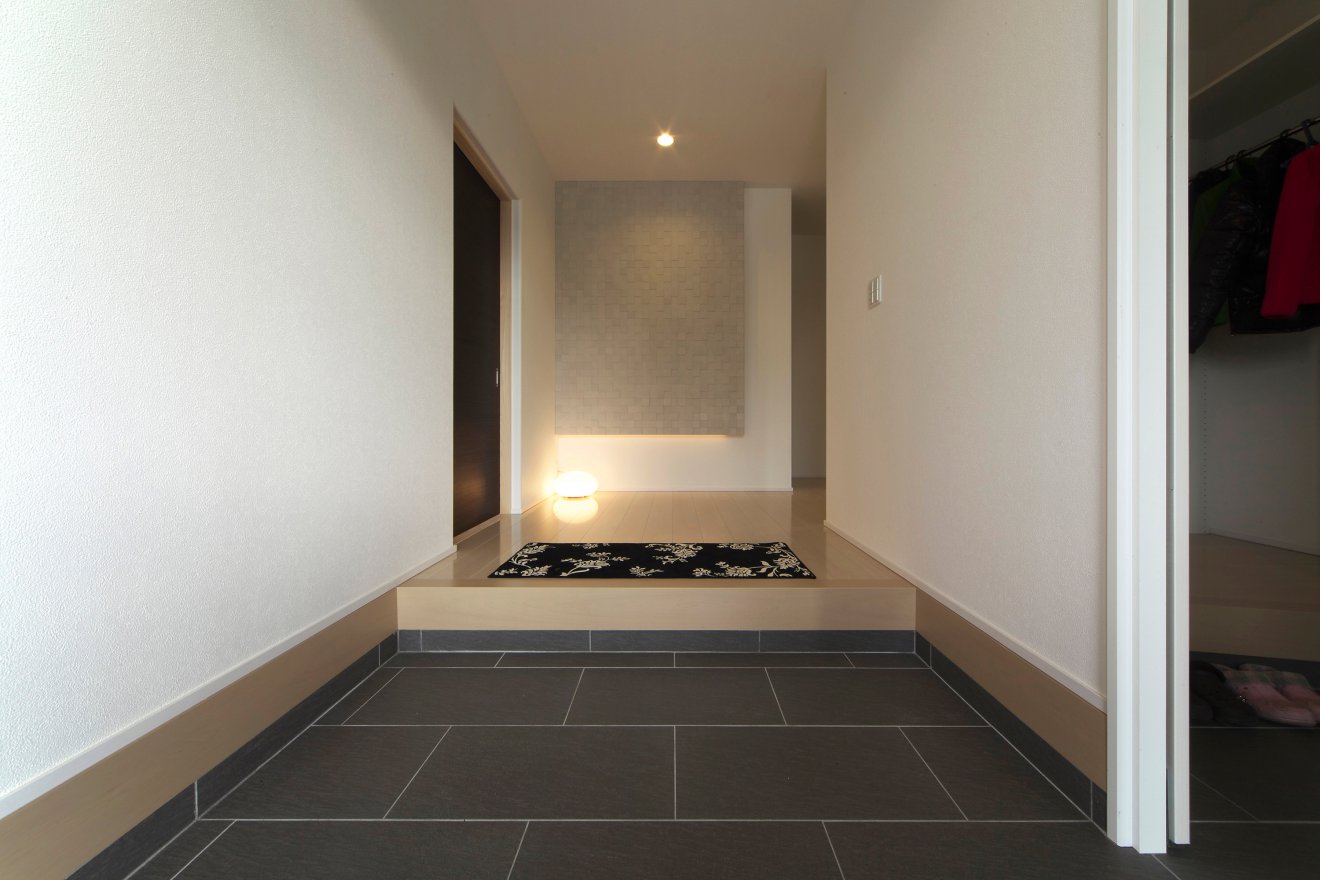 【玄関ホール】たっぷりの奥行きとワイドな上がり口の玄関ホール。 【シューズクローク】玄関横のシューズクロークは、収納スペースも広々しています。壁に鏡もあり、身支度バッチリです。