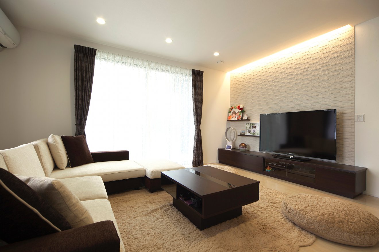 【リビング】テレビの背面を飾るのは、タイル調のエコカラット。リビング全体をやさしい雰囲気にしてくれます。