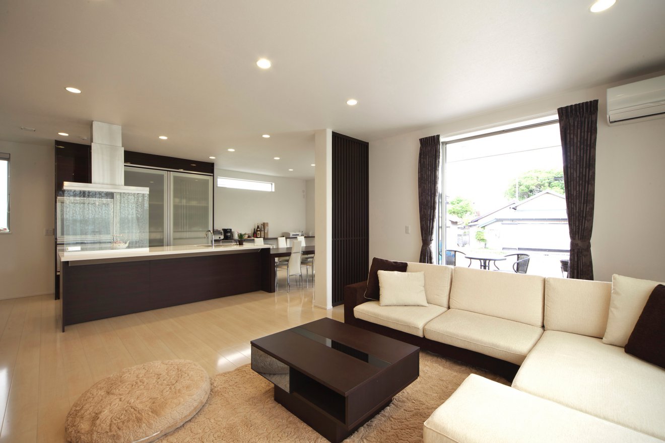 重厚感のある外観から室内へ入ると、大空間のLDKが広がります。全開口の大きな窓を開ければテラスへと続き、家族や友人とのBBQが盛り上がるようにデザインしました。