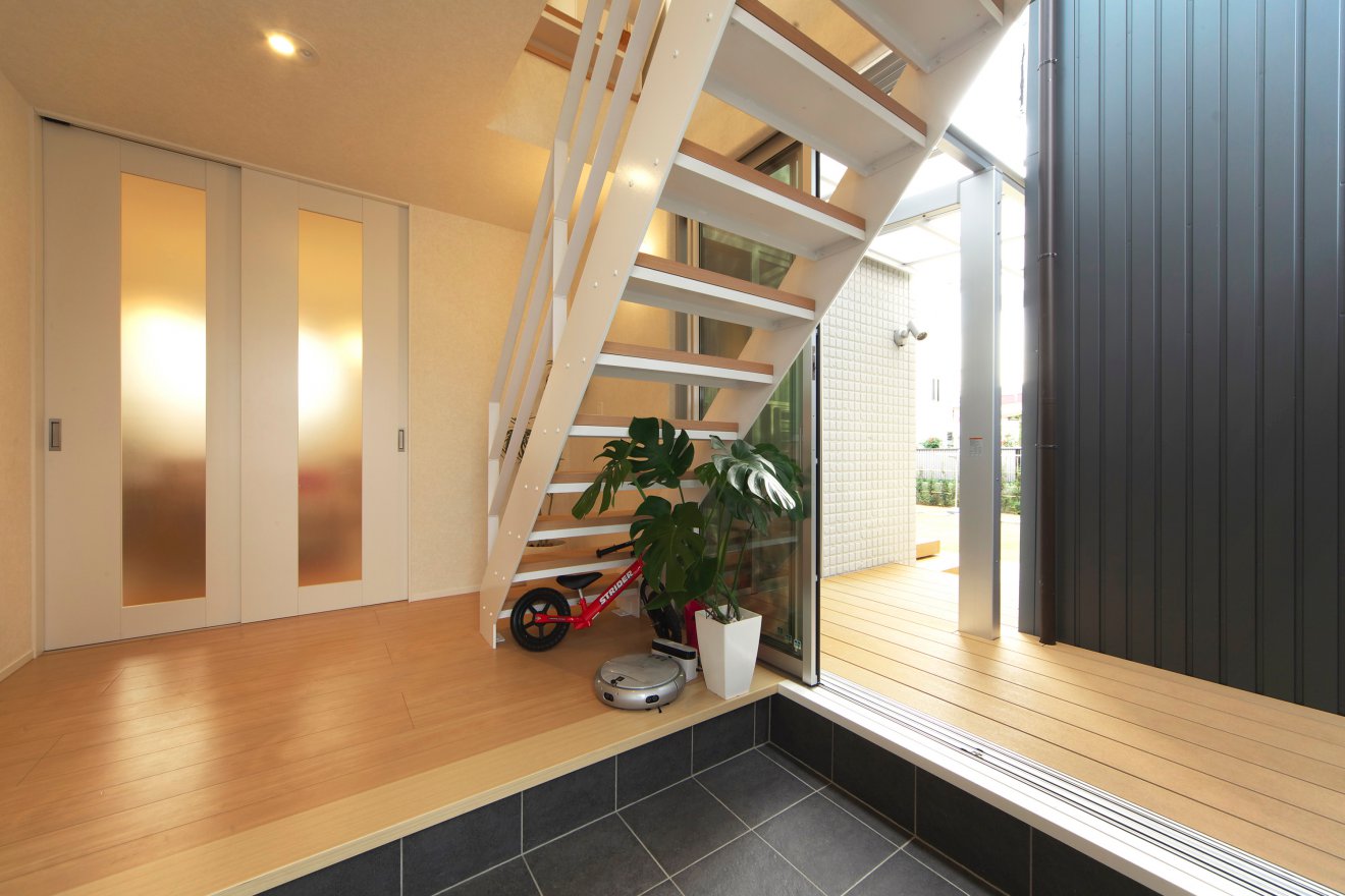 【玄関ホール】玄関ホールの横に全開口窓とデッキを設けて、母屋の庭につながる仕掛けを施しました。