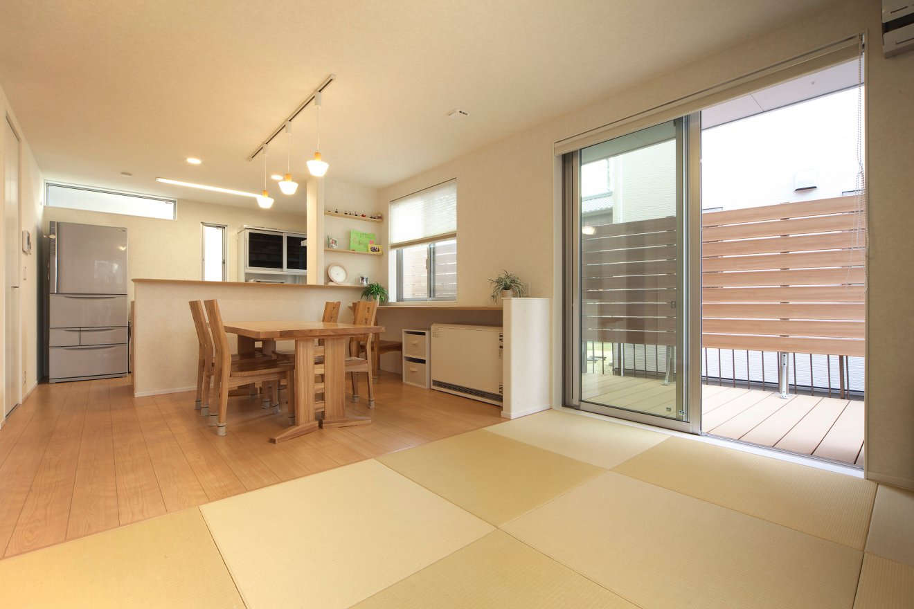 【畳コーナー】将来単独の和室として使えるように、壁を取り付けることを想定して設計しています。