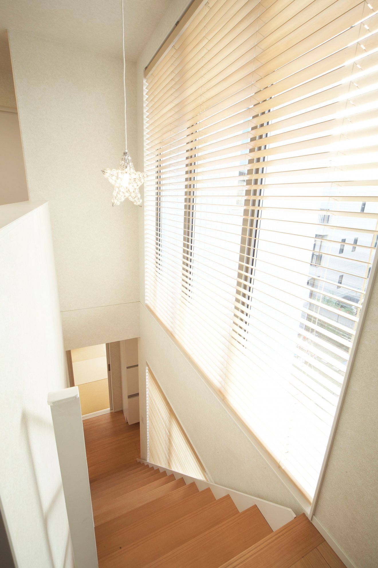 【階段】階段にも大型の窓を採用して、住宅の密集する都市にありながらも、できるだけ外の光が取り入れられるようにしました。夜になれば、星型のペンダントライトが可愛らしく輝きます。