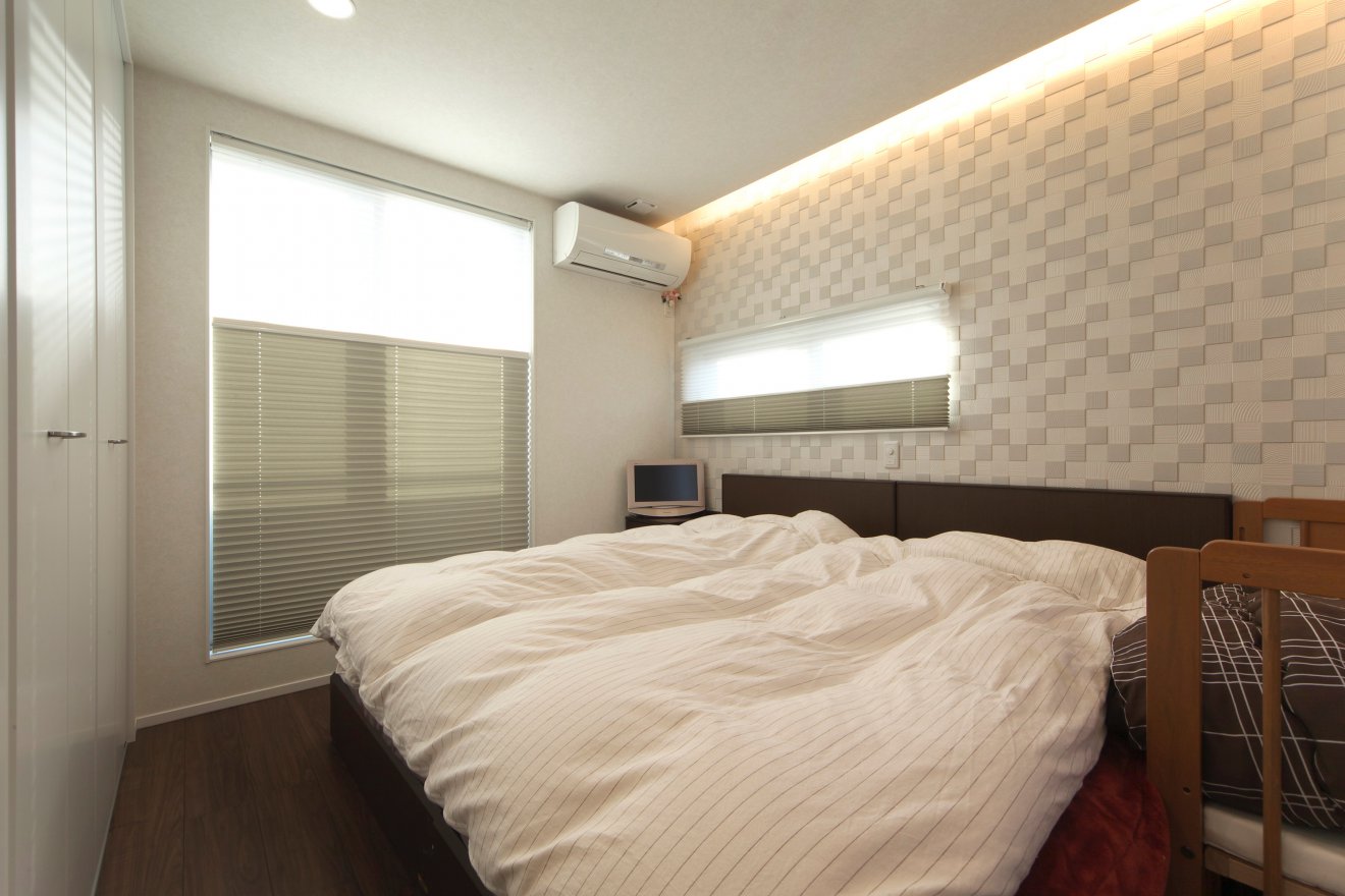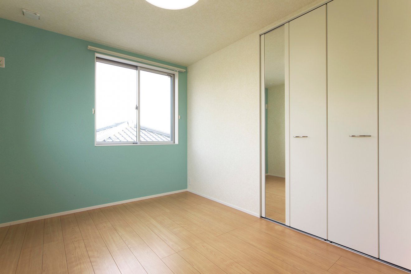 【子供部屋】ミントグリーンの壁が爽やかなお部屋。成長した時のことも考えて、収納もたっぷり用意しました。 【主寝室】壁一面にエコカラットを施工。湿気や臭いを吸収するため快適に過ごせます。
