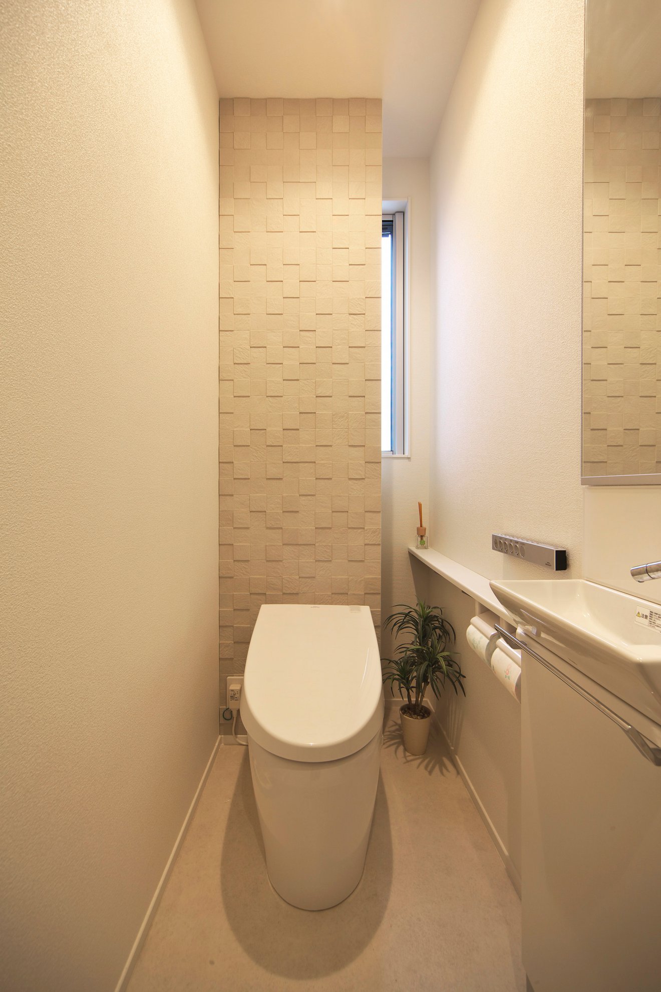【トイレ】トイレ壁にもエコカラットを採用。浮かび上がる陰影が、落ち着いた雰囲気を漂わせています。